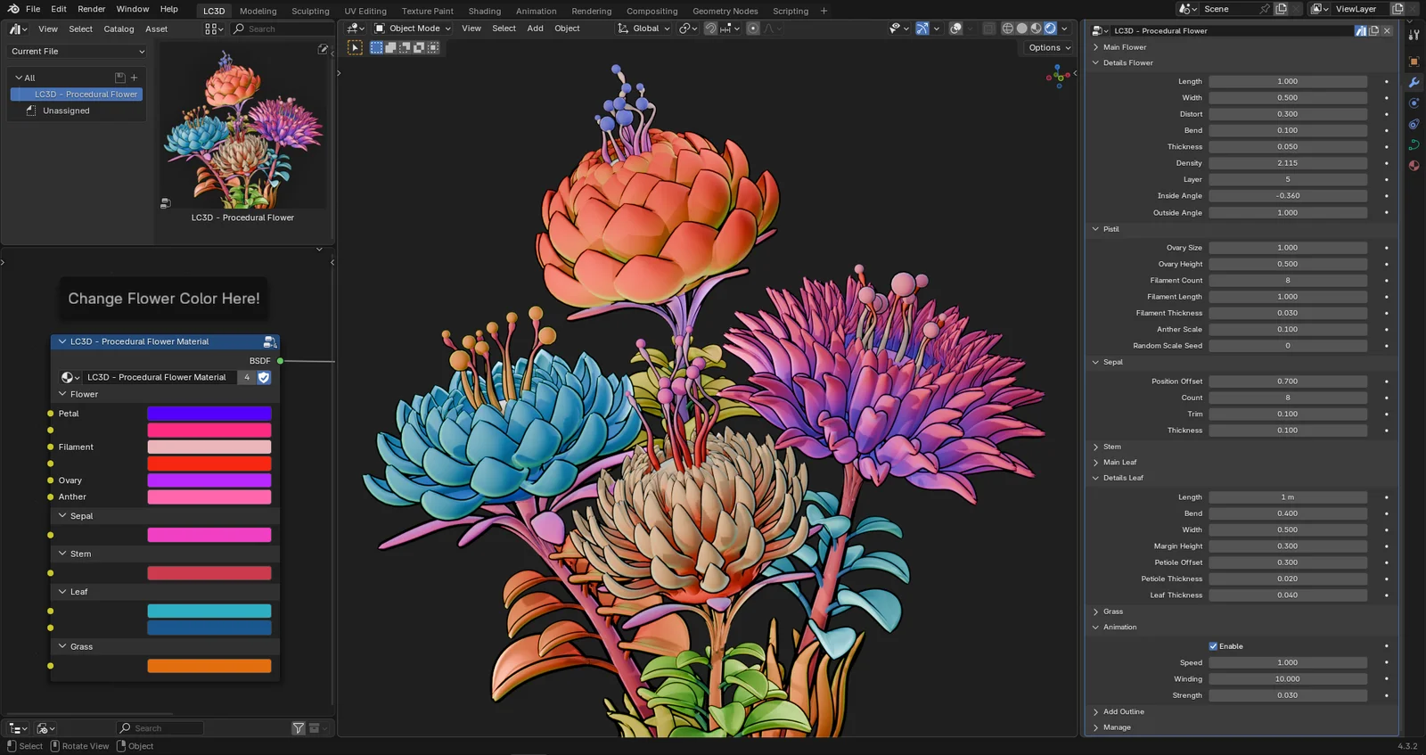 A procedural geometry nodes setup for generating stylized flowers within Blender. The tool provides customizable parameters for individual plant components, including the petals, pistils, sepals, stems, leaves, and surrounding grass. It features built-in animation controls, an outline generator, and a procedural shader group for adjusting flower colors. The setup is designed to integrate directly with Blender's Asset Browser.