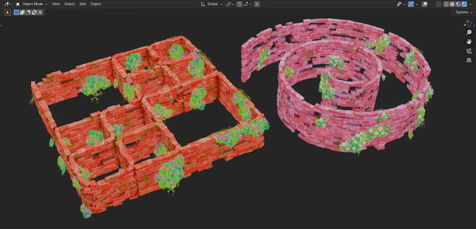 A Geometry Nodes setup that generates procedural stylized brick walls within Blender. Designed primarily for the EEVEE render engine, the tool functions as an asset library component, allowing for drag-and-drop integration directly from Blender's Asset Browser.