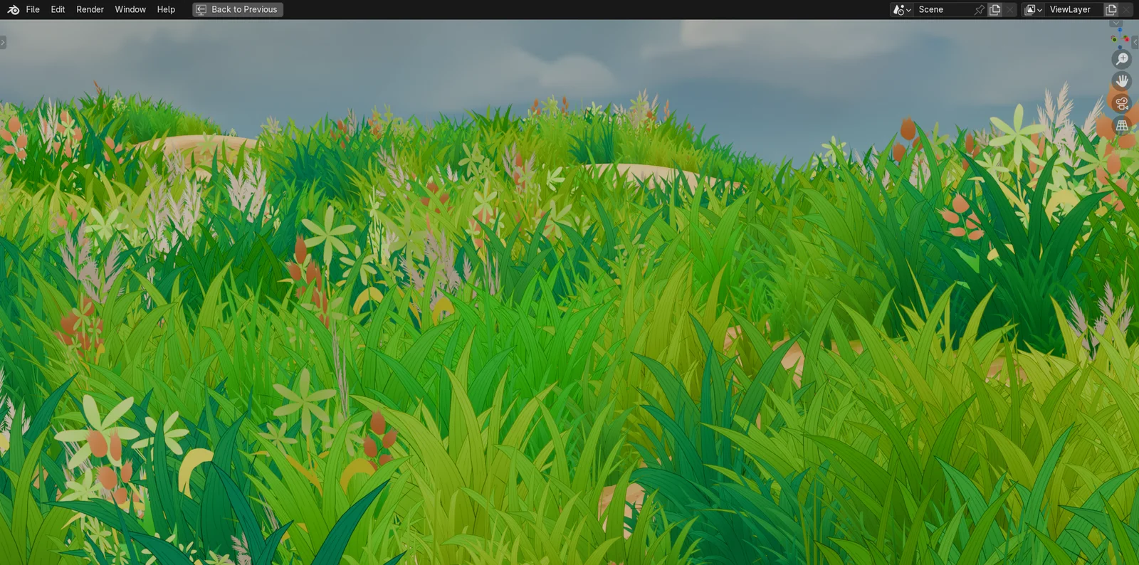 This Geometry Nodes setup creates procedural, stylized grass fields. It allows for the customization of both grass and flower elements within the field. The system supports the addition of custom pathways via weight painting and includes wind animation effects. It is configured to work with the EEVEE render engine and is set up for use within Blender's Asset Browser.
