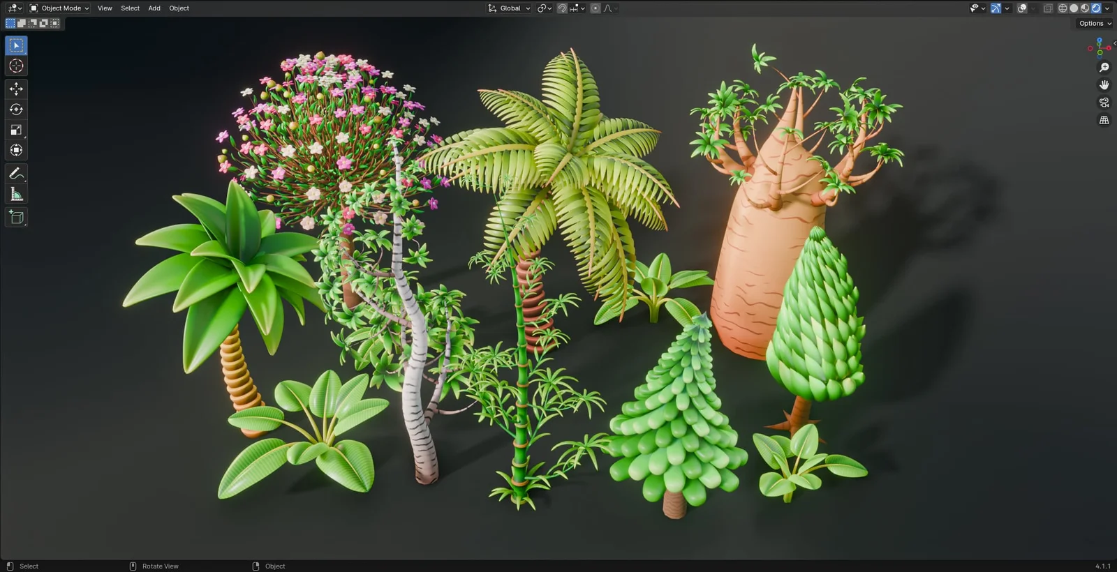A Geometry Nodes asset for generating simple, stylized trees in Blender. Users can customize the shape and appearance of the trunk, branches, and leaves through adjustable parameters to suit specific artistic needs. The resulting trees are suitable for use in animations, game environments, and stylized scenes.
