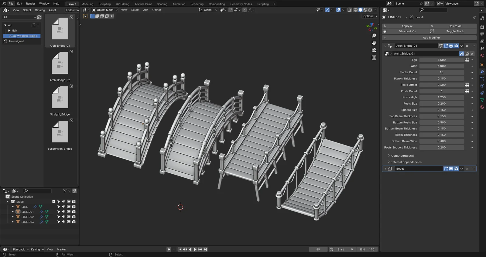 A geometry nodes setup for generating customizable wooden bridges. The asset can be dragged and dropped into a scene, providing a parameter setup interface to control its structure. It includes pre-configured materials for the wood components.