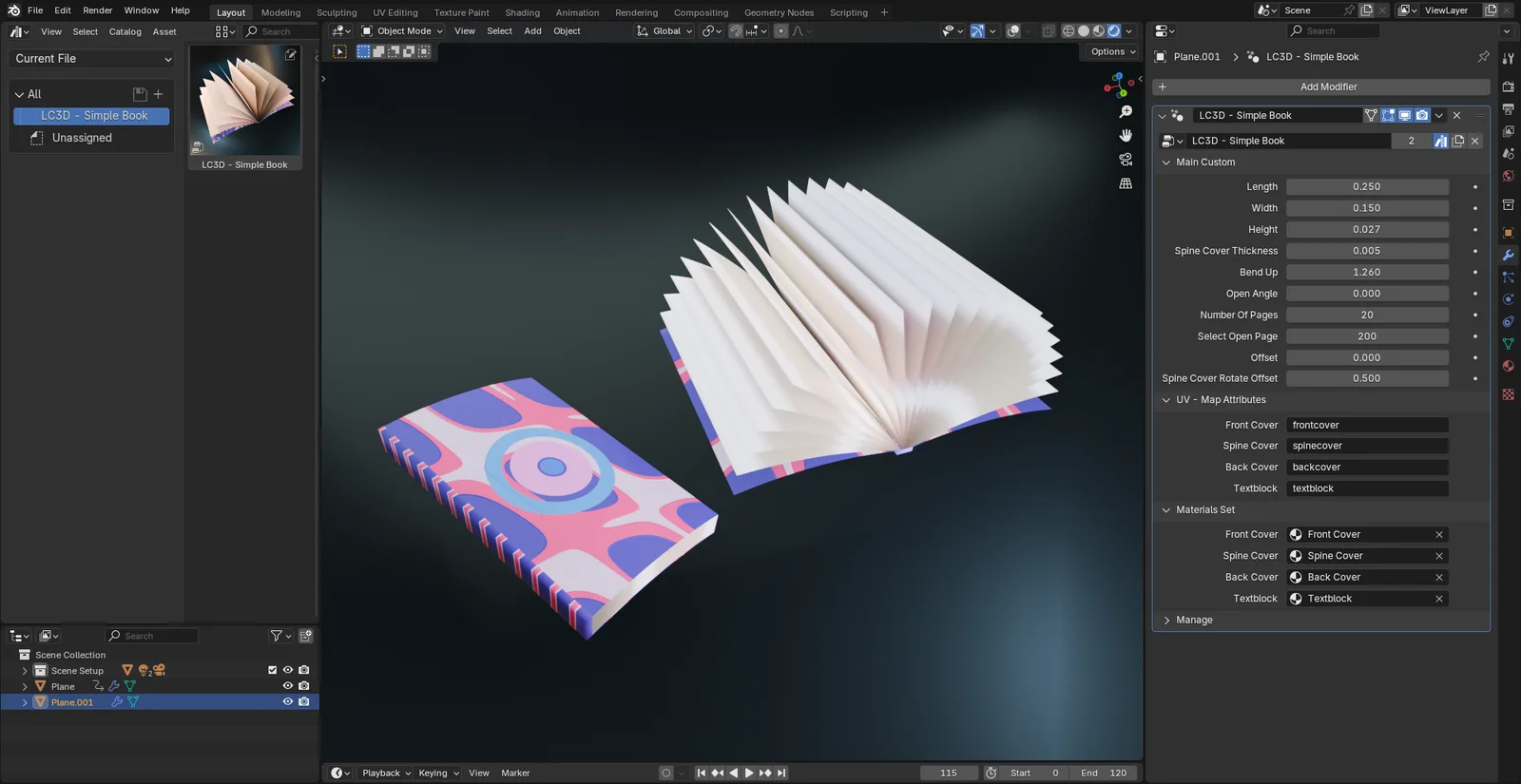 This Geometry Nodes setup generates a customizable book model directly within Blender. The asset features procedural controls to adjust the book's dimensions and appearance, alongside built-in animation capabilities. Procedurally generated UV mapping is included to facilitate custom texturing and material assignment.