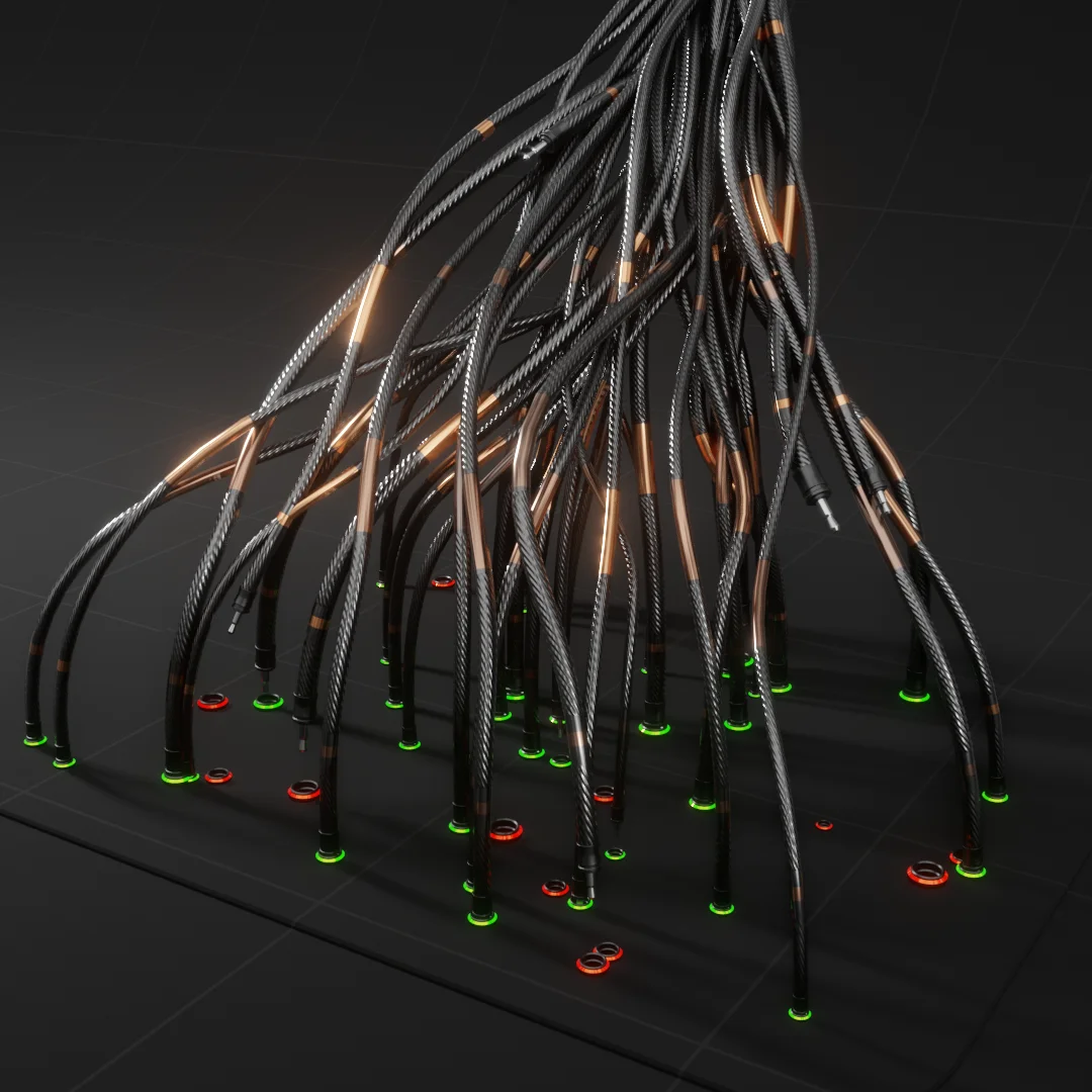 This procedural cable generator is built using Blender's Geometry Nodes system to attach cables to a selected object automatically. The start position of the cables is determined by a target object's position, and the generation works on deforming meshes by spawning directly on the attachment object's vertices. Users can adjust settings such as cable amount, size, progression, and resolution directly from the modifier properties panel.