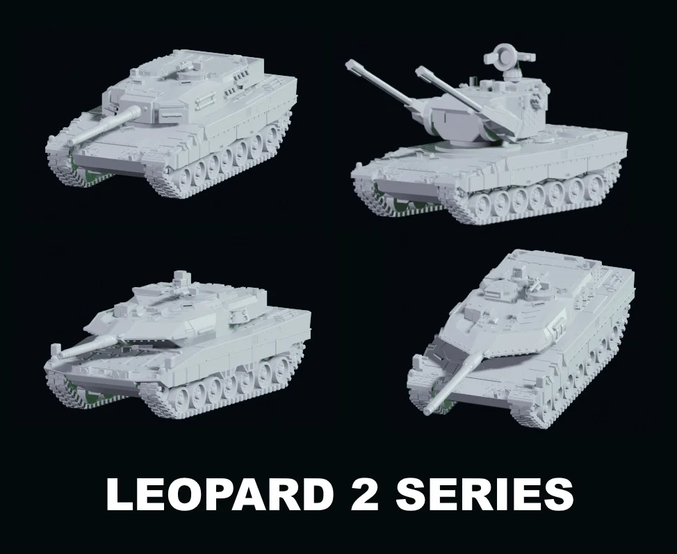 A collection of 3D printable models featuring several Leopard 2 tank variants, designed at 1/100 scale (15mm). The set includes the Leopard 2A4 FIN, Marksman, 2A5, 2A6, and the STRV 122. Both presupported and unsupported files are provided to accommodate resin and FDM printing workflows. Additional components include accurate Finnish Leopard 2A6 hull and side skirts with proper recesses.