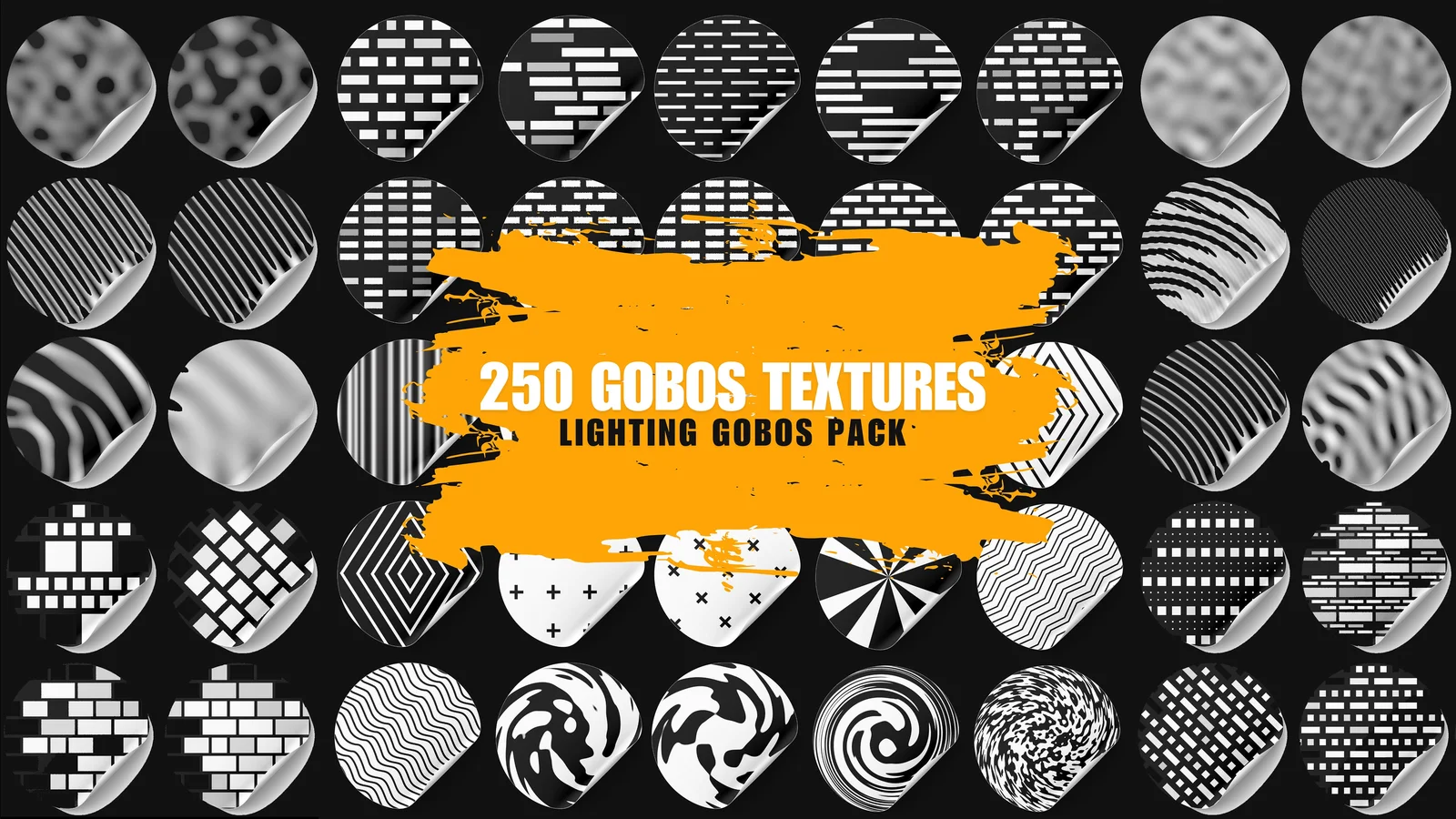 A library of over 250 gobo textures designed to project patterns and simulate realistic lighting effects in 3D scenes. The collection includes various masks that can be attached to light sources, such as spotlights or area lights, to mimic shadows cast by window frames, tree leaves, and other environmental elements.