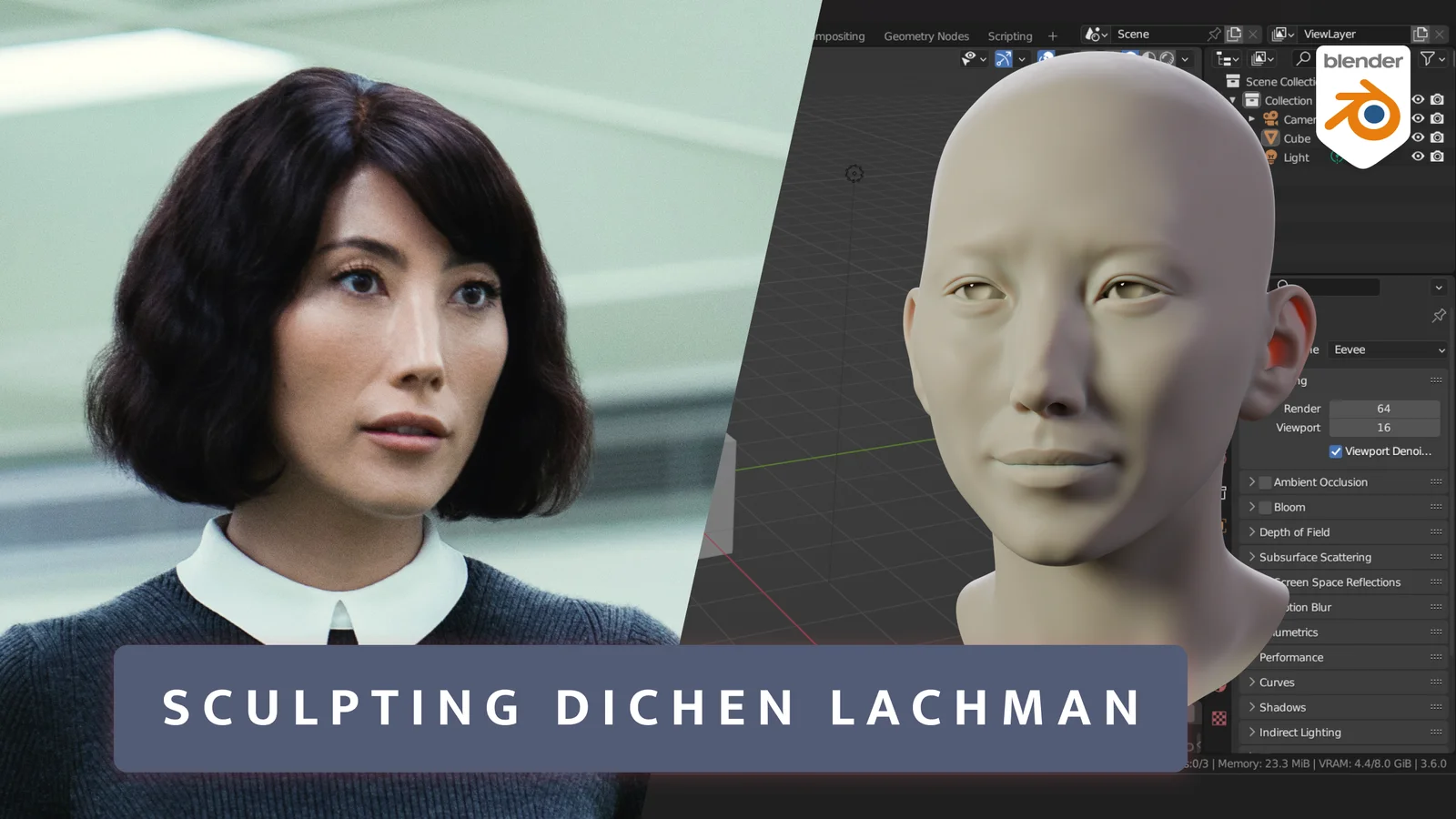 This asset contains a character likeness sculpt of Dichen Lachman, provided entirely within a Blender project file. The file includes two variations of the geometry: the original raw sculpted mesh and a cleaned, retopologized version. Both models are scaled to real-world proportions for easier integration into existing scenes.