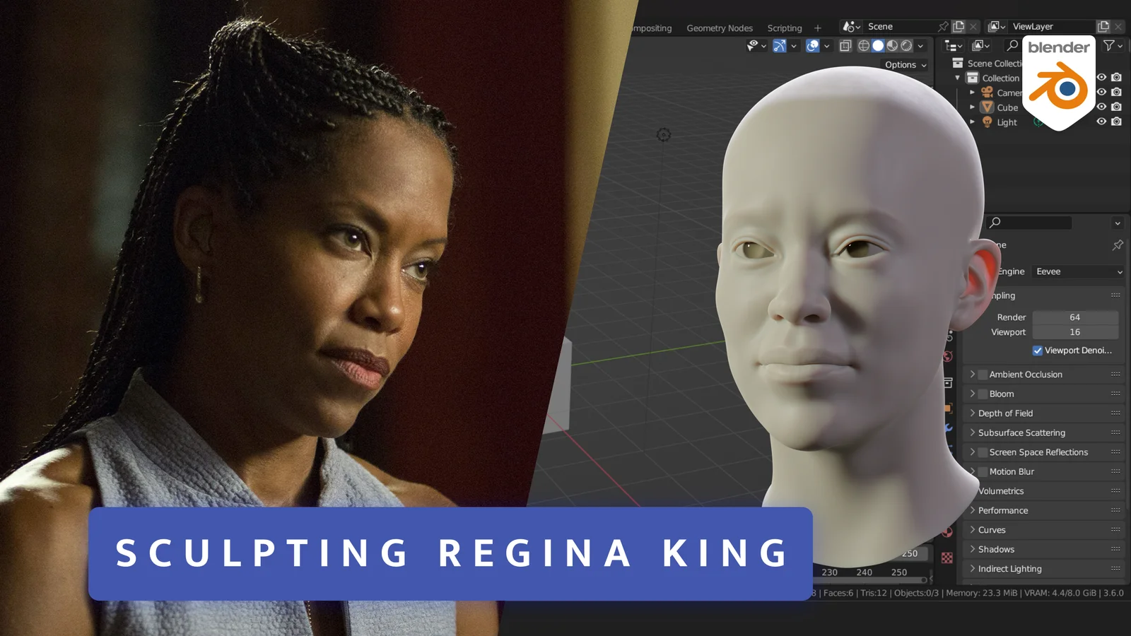 This is a 3D model of Regina King created as a portrait sculpting exercise. The provided .blend file contains both the original raw sculpt and a retopologized version of the mesh. The model has been set to real-world scale proportions.