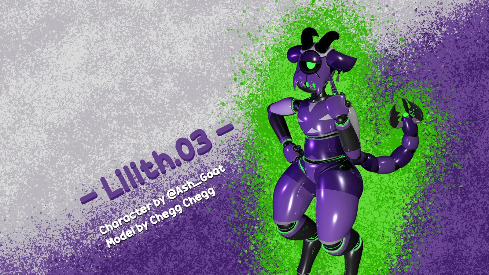 Lilith.03 is a rigged robotic character model featuring a gothic design with blue-violet and purple coloring. The character geometry includes a spherical head with goat-like horns, ears, and fangs, along with a tail ending in a pincer. The package provides the rigged base FBX file and accompanying standard texture sets, ready for import into standard 3D software.
