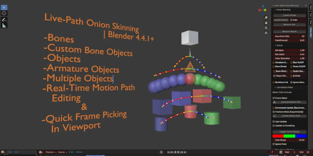 The Live Path Onion Skinning addon provides direct manipulation of motion paths for objects, armatures, and bones. It features live updates to onion skins across multiple objects simultaneously. Users can quickly select, add, and remove items from the onion skinning display either in groups or individually.