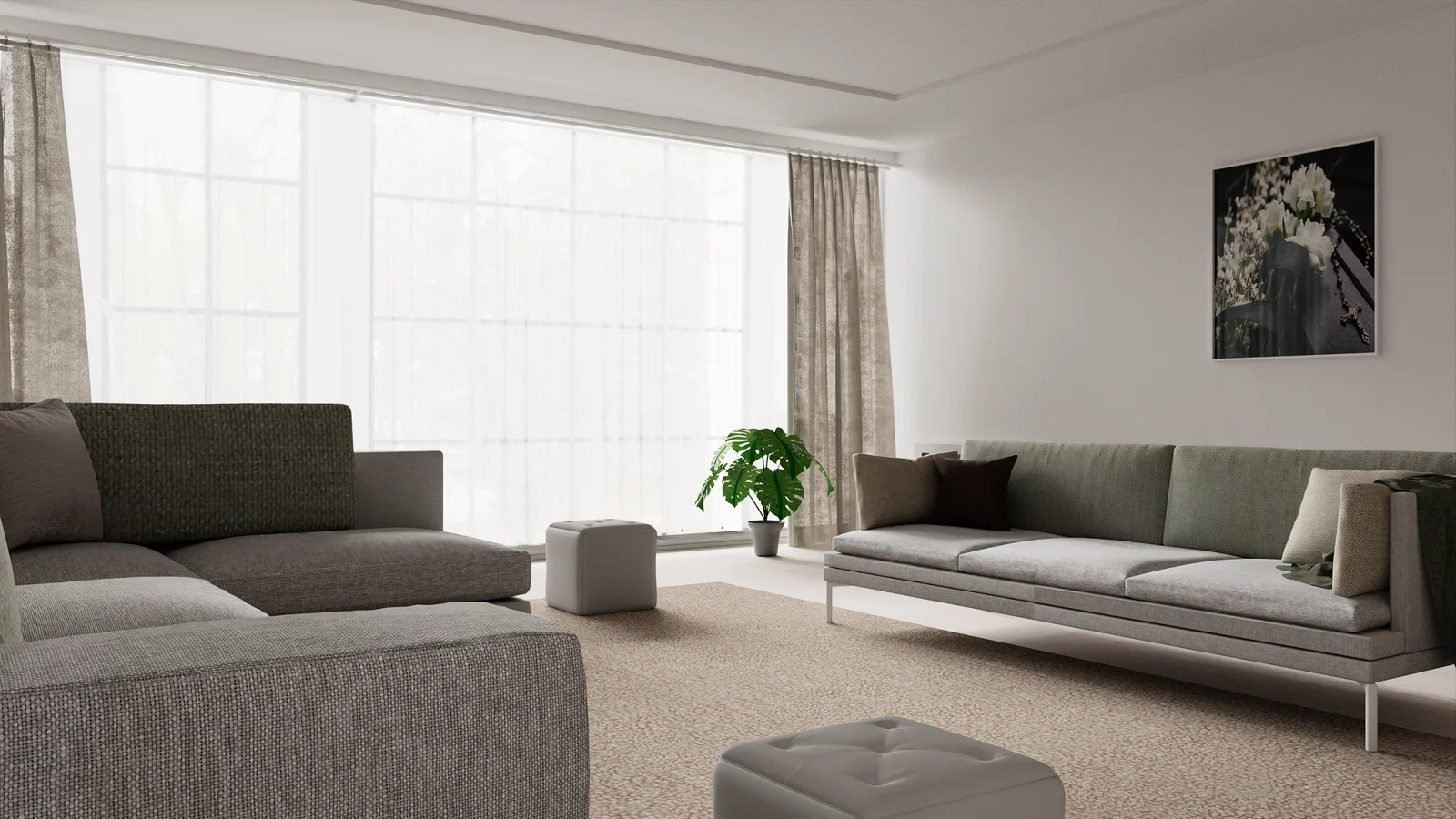 The environment contains fully textured 3D models including two sofas, wall art, a TV stand with a television, a curtain set, a carpet, and transparent glass elements. Three HDRI backgrounds are provided. Textures are packed into the blend file and the lighting has been baked.