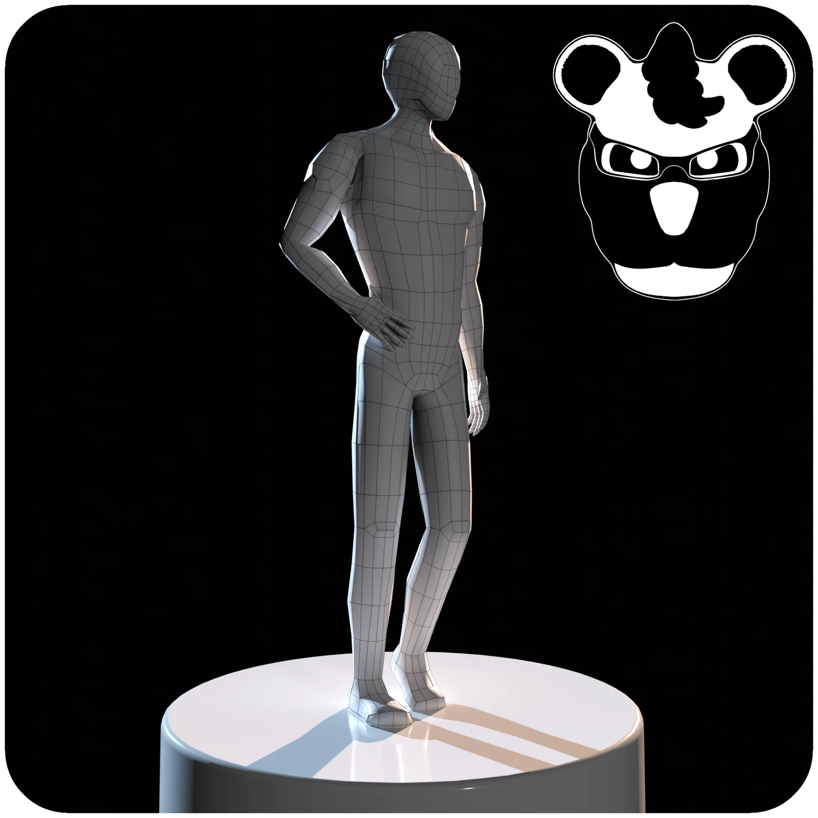 A low-polygon male base mesh character with approximately 3,000 triangles. The model comes pre-rigged using Blender's Rigify armature system for character animation, and includes an exported FBX format file.
