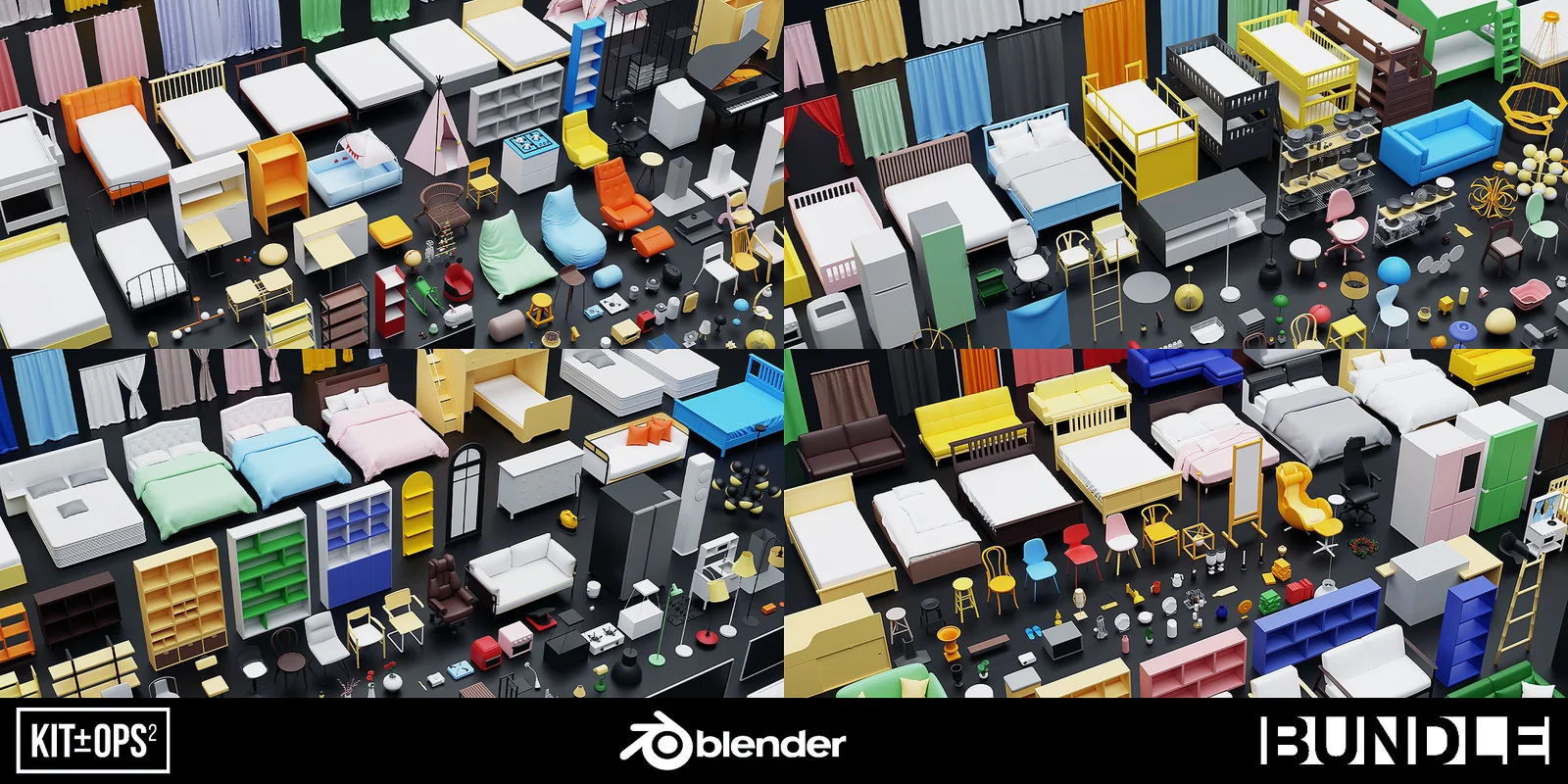 The collection is provided in .blend file format and is configured for drag-and-drop functionality within the Blender 3+ Asset Browser. It also includes a KPACK format, which is compatible with both the free and professional versions of the Kit Ops add-on. The models feature adjustable colors and are compatible with both the Cycles and EEVEE rendering engines.