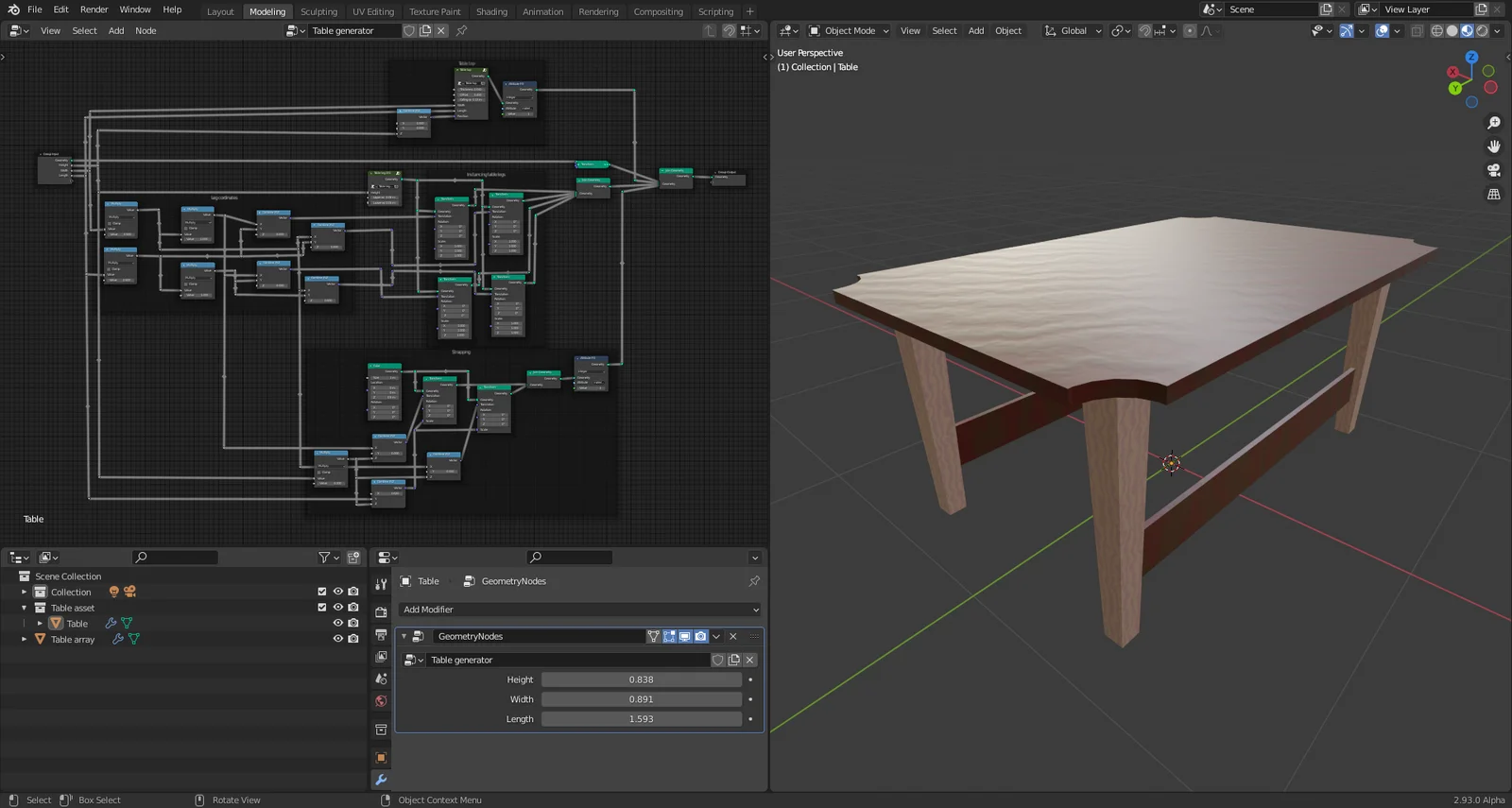 A procedural generator designed to create simple, low-poly tables using Blender's Geometry Nodes system. The project file functions as an educational example to illustrate procedural modeling concepts, specifically demonstrating how primitive nodes can be utilized to replicate the behavior of array modifiers.