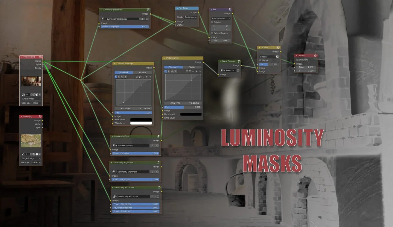 Luminosity Mask provides a custom compositor node setup to create selections based on image brightness within Blender. The nodes generate monochrome masks that isolate highlights, shadows, or mid-tones, functioning identically to brightness-based masks in dedicated image editing software. These masks can be mapped as alpha inputs to other nodes, restricting color or contrast adjustments solely to the targeted luminance range without impacting unwanted areas.