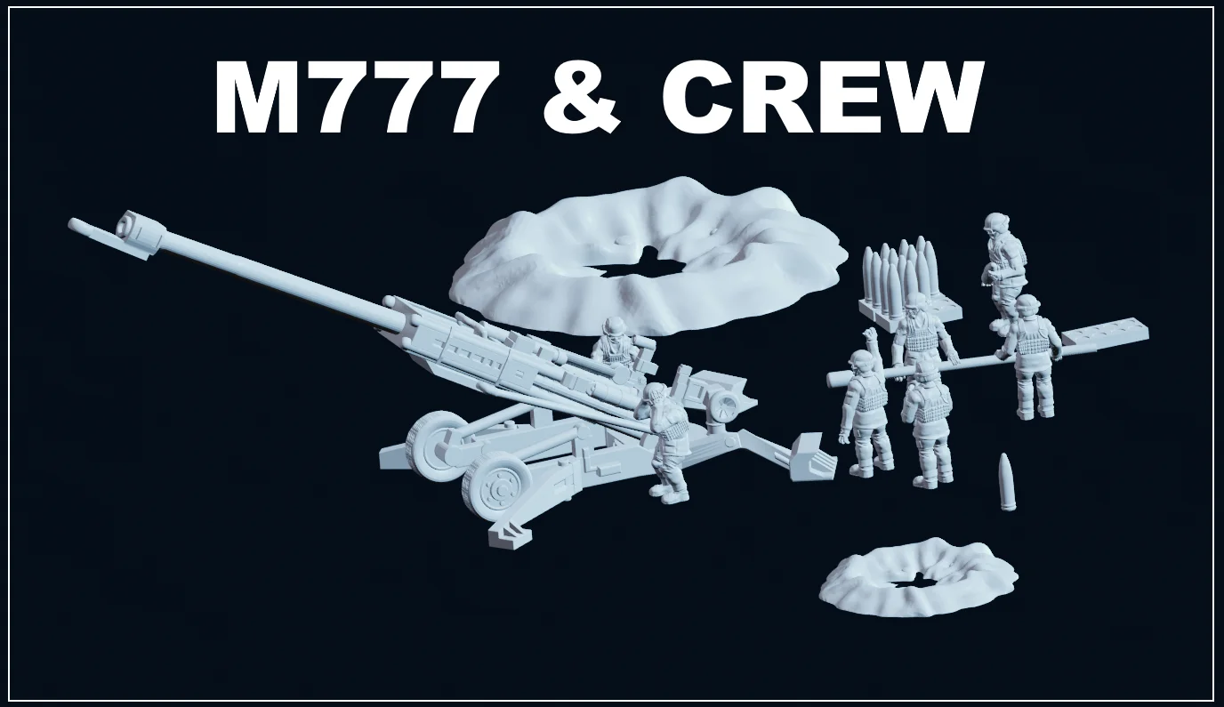 A 3D model kit containing an M777 Howitzer artillery piece and accompanying crew, designed primarily for 3D printing. The files are provided in 1/100 scale, commonly referred to as 15mm scale. This collection features a split version of the howitzer for smaller build plates, along with seven crew member figures representing US and Canadian forces. Additional set pieces include ammunition pallets with and without shells, individual shells, and two sizes of blast craters. The files are provided in STL format and include presupported versions for standard resin printing workflows.