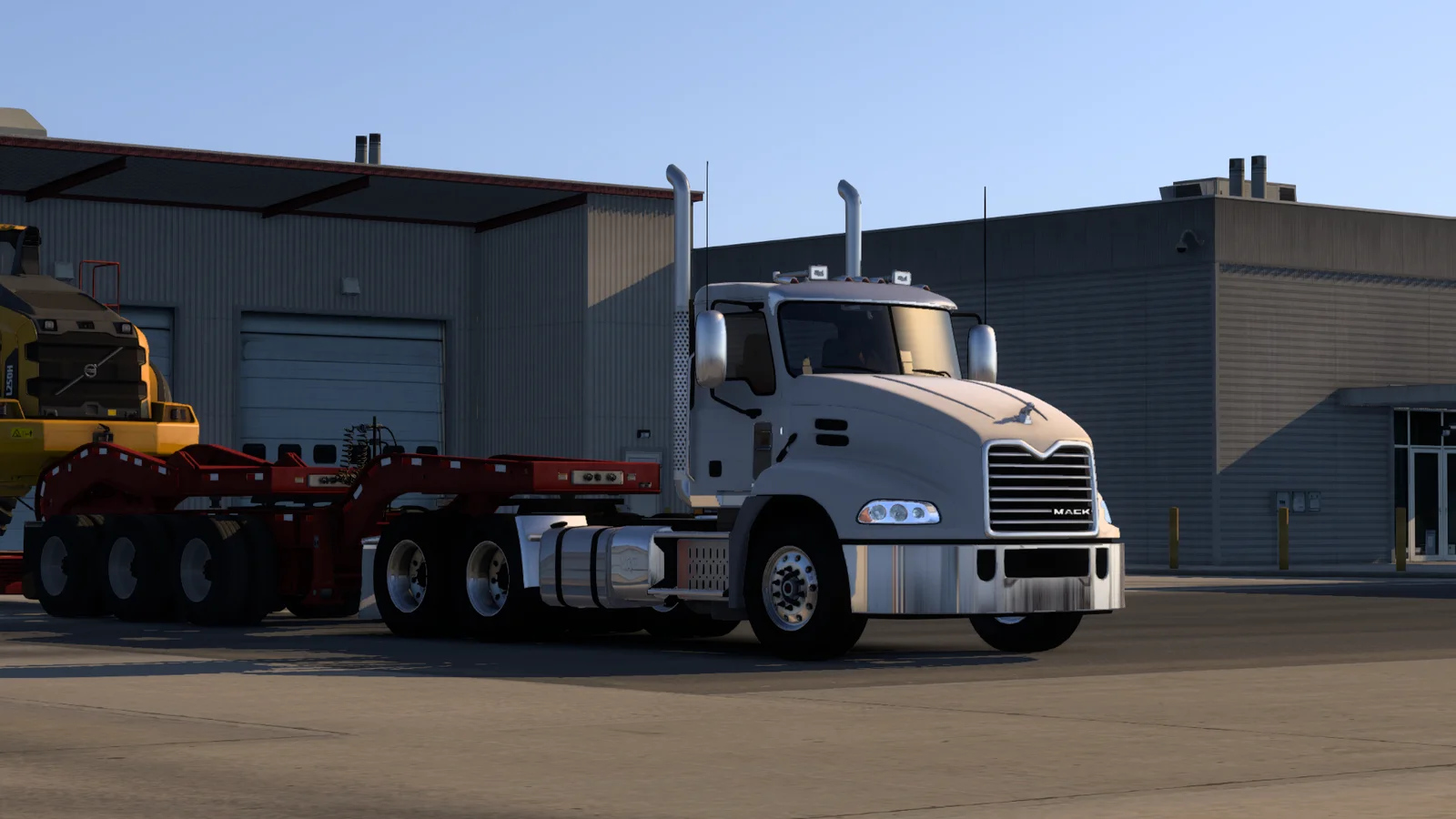 A 3D model of the Mack Pinnacle truck featuring several cabin and chassis configurations. Cabin options include a day cab, flat top sleeper, sleeper with shoes, mid-roof sleeper, and a standard Pinnacle sleeper. Users can choose from five chassis types: a 4x2 for the day cab, short and stock 6x4 variants, as well as standard and long 8x4 options. The package also includes open definition engine and transmission setups.