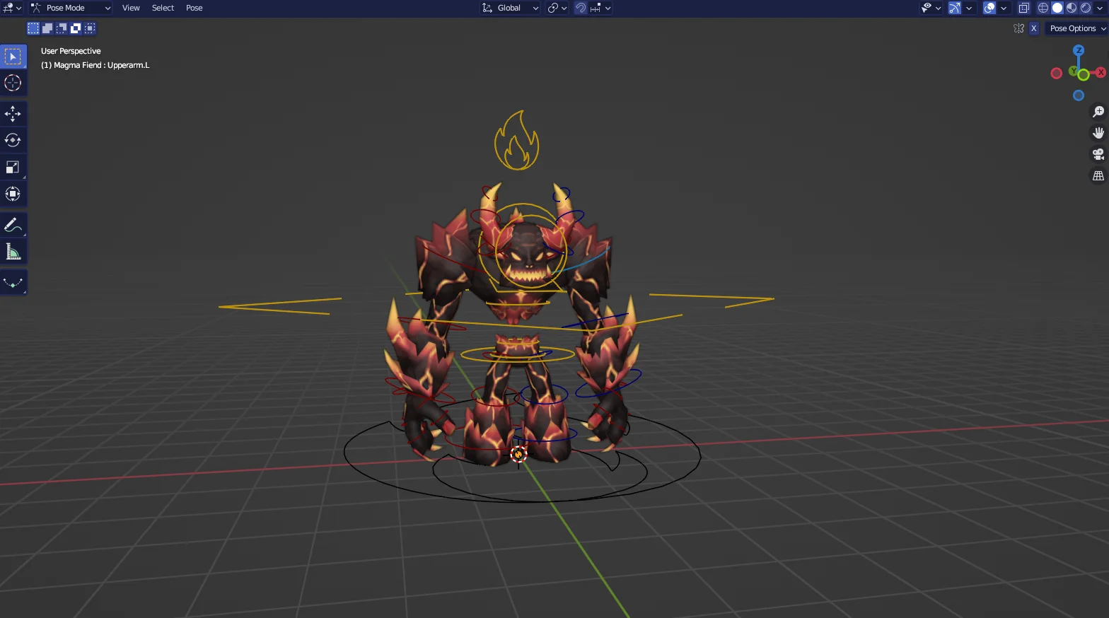 This is a character rig based on "The Magma Fiend" from Roblox. The rig includes custom parameters for adjusting the character's overall brightness and magma coloration. It is built with stretchable arms and legs for flexible posing, and includes specialized wrist and foot controls for detailed animation work.