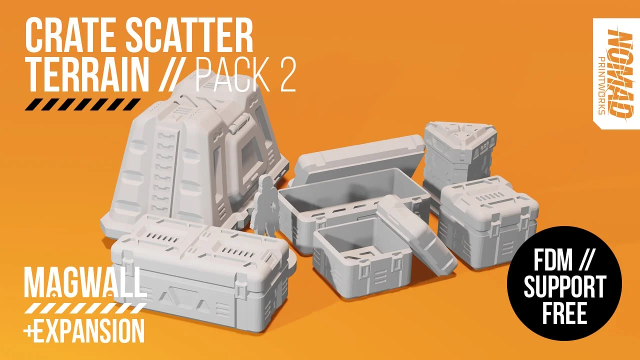 A collection of nine 3D printable STL files designed for tabletop scatter terrain. The set includes single, double, and tri-crate formations, alongside open variants and a hover crate with an included stand.