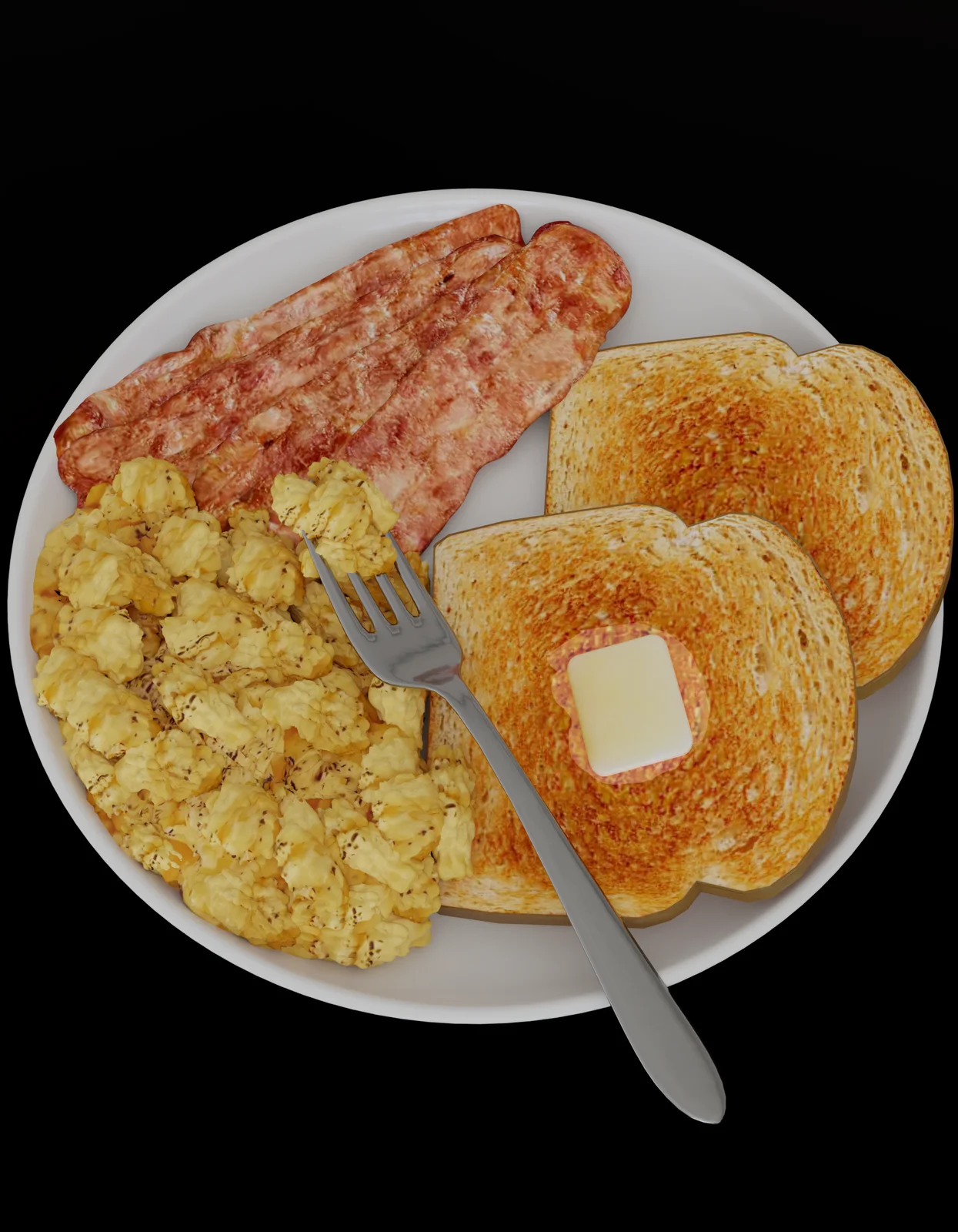 This collection provides a variety of high-poly breakfast food models created in Blender. The set includes multiple variations of eggs, toast, bread loaves, and turkey bacon. It also features beverages like orange juice in both bottle and glass formats, alongside prepared plates of food and bowls of oatmeal. The assets are suitable for populating kitchen scenes or creating detailed food visualizations.