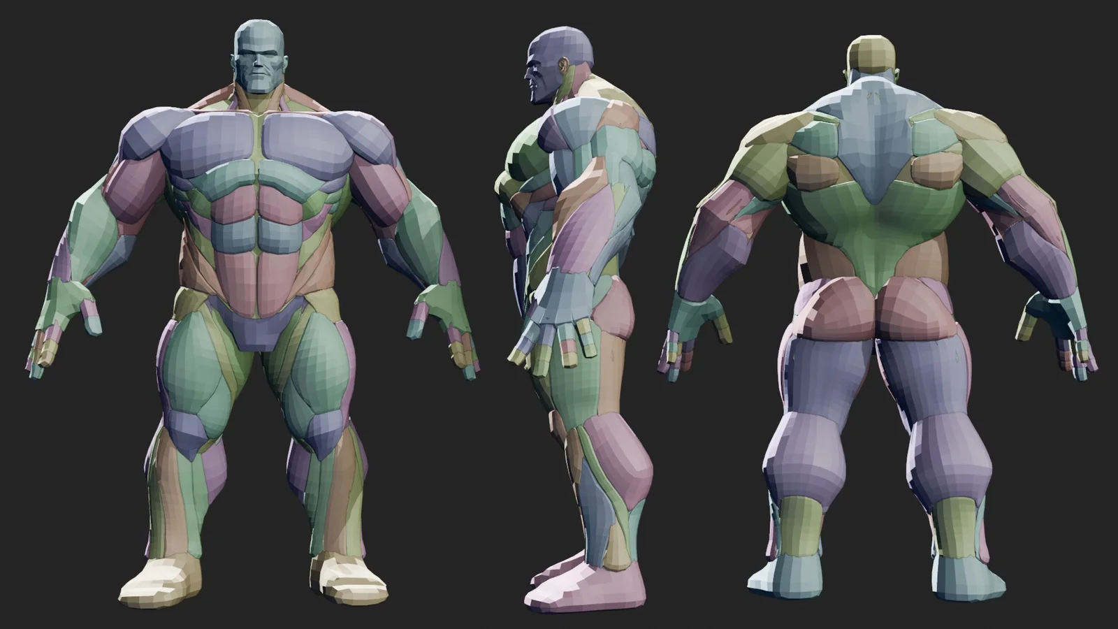 A modular anatomy blockout model designed as a starting point for creating muscular or heroic characters. The mesh is separated into individual components, providing the head, torso, arm, hand, and leg as distinct pieces. It serves as an anatomical base mesh for detailing, sculpting, and modeling workflows.