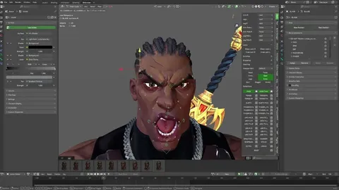 A fully rigged character model of Blade from Marvel Rivals, designed for non-commercial and educational use. The rig includes a custom Python script that generates a dedicated UI panel in the N-shelf for managing parent relationships, toggling knee and elbow locks, and handling FK/IK transitions. Snapping tools are provided to quickly align FK and IK setups, including a dedicated snap function for dual-wielding hand poses. The character features an advanced hand rig system blending forward kinematics, inverse kinematics, and macro controls. Facial animation is driven by a custom setup with nine preset expressions available in the pose library. Additional controls allow users to toggle weapon visibility, adjust emission settings, and isolate bone layers for a cleaner animation workflow.