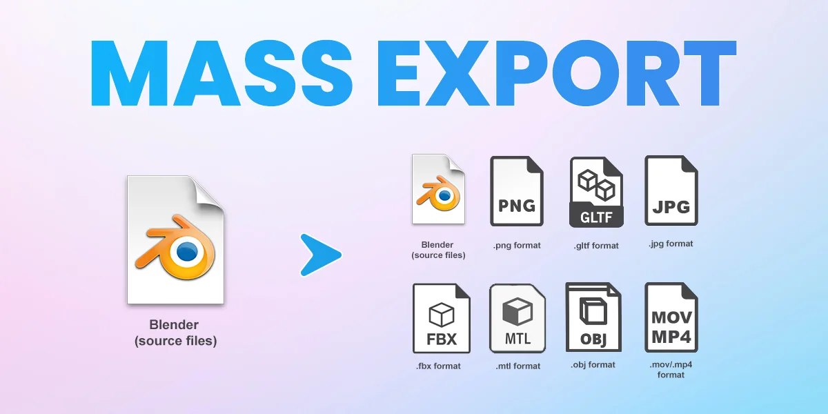 Mass Export is an add-on that automates the process of saving multiple objects and collections into separate files. It supports 3D formats including FBX, OBJ, GLTF, and native BLEND files, alongside image and video formats like JPG, PNG, MP4, and MOV for batch rendering. Users can choose to merge the contents of a collection into a single exported file or save each object individually.