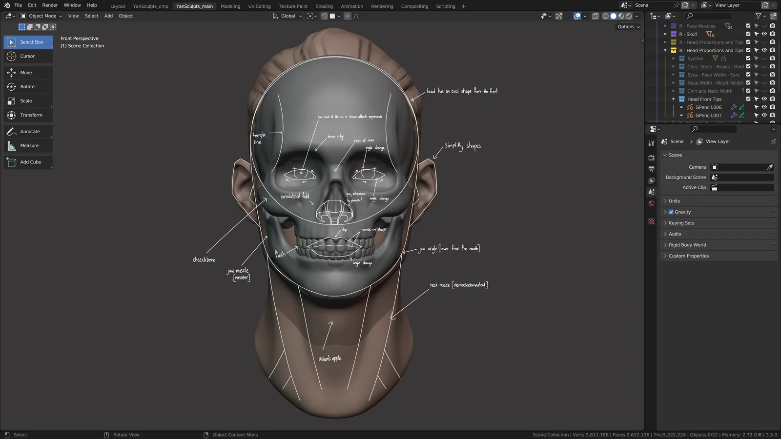 This is a video training course focused on the techniques and foundations of sculpting heads in Blender. The curriculum begins with anatomical fundamentals, covering skull structures, facial proportions, and the distinct shapes that differentiate male and female anatomy. Students can follow along with real-time sculpting exercises using the provided reference images and starting project files.