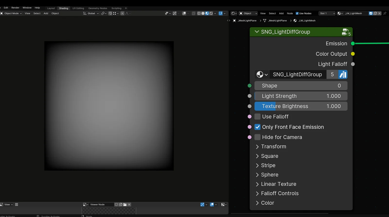 This shader node group allows users to project procedural shapes and textures from meshes or standard area lights. It includes controls for shape selection (square, stripe, sphere, and linear), light strength, texture brightness, and distance falloff. The setup relies on UV coordinates to manipulate gradients and textures from the center.