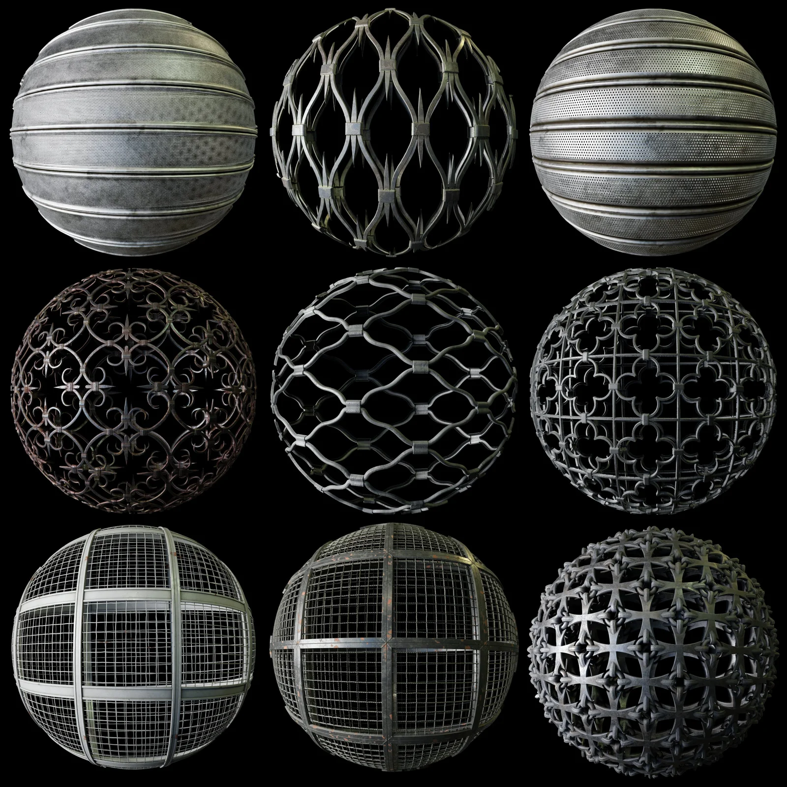 This pack contains 9 PBR metal materials, featuring various grid and shutter designs. The included textures are 4K JPEGs, offering Diffuse/Base Color, Roughness, Normal, Height, and Metallic maps. A Blender 4.5 project file is also included with the materials pre-setup.
