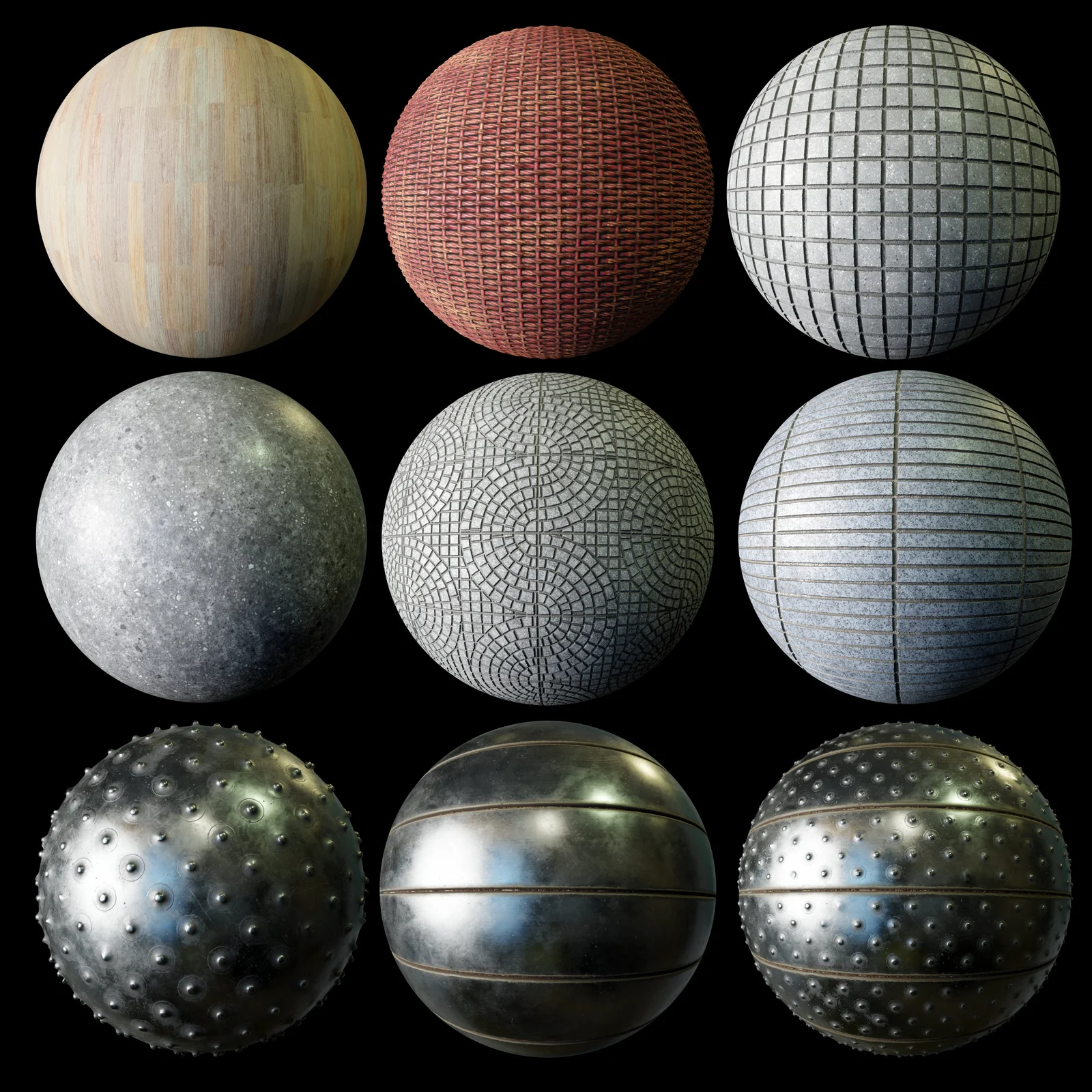 This collection includes nine physically based rendering (PBR) materials supplied as 4K JPEG textures. The pack provides a variety of surfaces, including laminated wood, a weaved basket, and multiple variations of textured metals and terrazzo floors. Each material includes diffuse/base color, roughness, normal, height, and metallic maps. A pre-configured Blender project file is also included for immediate use.
