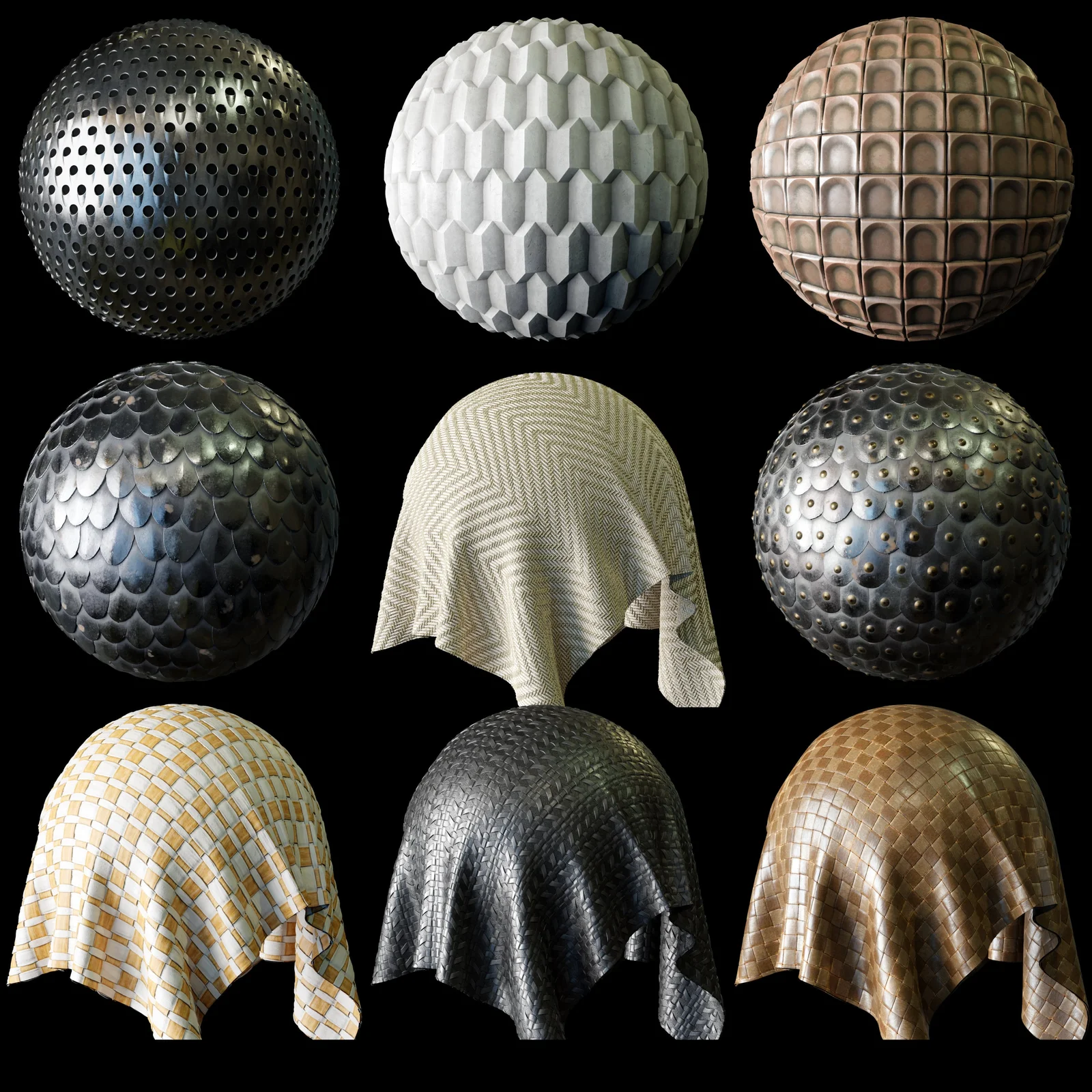 This texture pack contains a collection of nine PBR materials suited for various surfaces. The included assets cover design elements such as decorated and simple armor scales, decorative ceramic tiles, concrete bricks, and fabric, along with multiple leather strap patterns and a metal grater surface. All materials come with 4K resolution JPEG textures, providing Diffuse/Base Color, Roughness, Normal, Height, and Metallic maps. A pre-configured Blender file is also included.