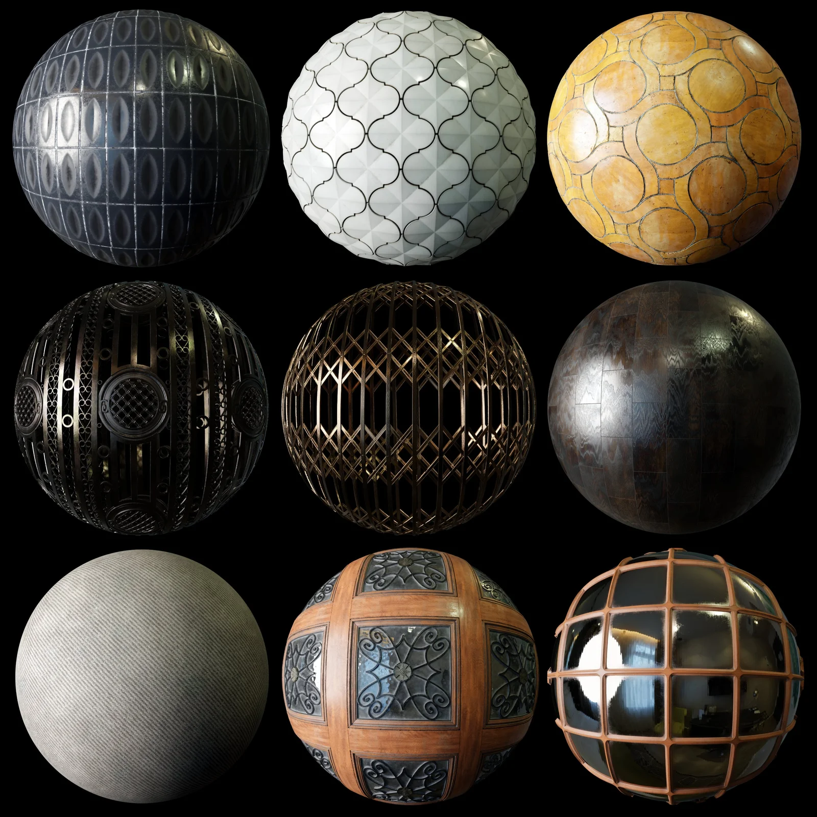 A collection of nine PBR materials featuring architectural and interior surfaces. The pack includes 4K JPEG textures with maps for diffuse or base color, roughness, normal, height, and metallic channels. Surface types include various styles of ceramic and decorative tiles, wooden floor tiles, an old brown rug, a retractable security door, and wooden framed windows with grills. A Blender file with the materials configured is included in the package.
