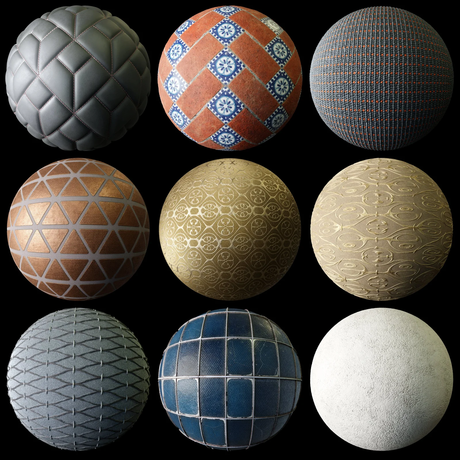 A collection of nine 4K PBR materials provided as JPEG texture sets. The pack includes a variety of surfaces such as decorative fabrics, wool, sci-fi fabric, floor tiles, couching leather, plaster and stone walls, and old blue windows. Each material includes diffuse/base color, roughness, normal, height, and metallic maps. A pre-configured Blender file is also provided with the materials set up.