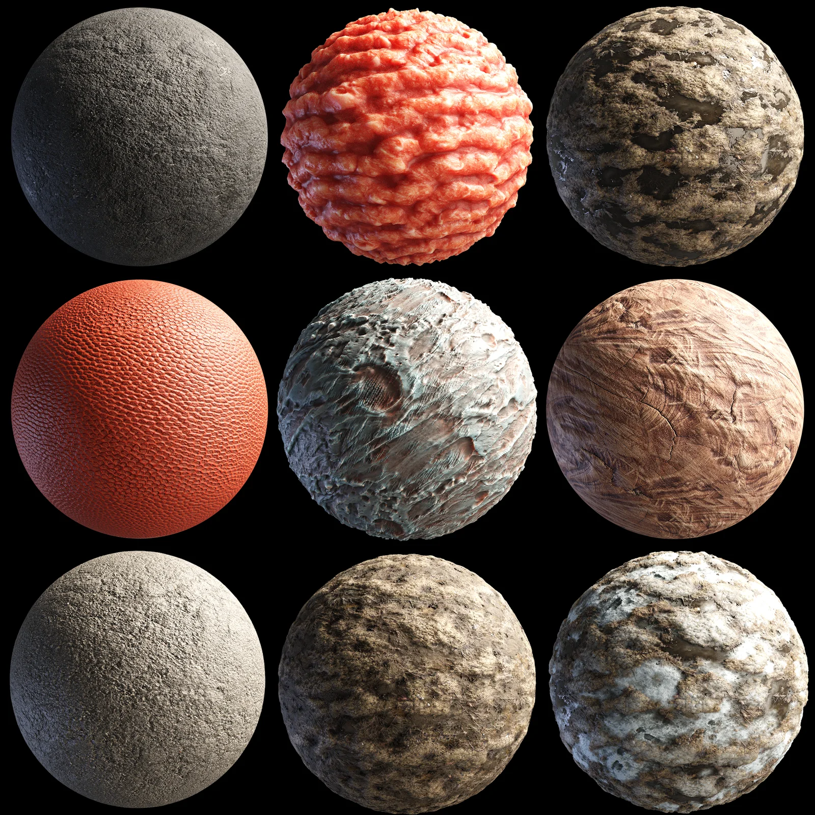 A collection of 9 PBR materials featuring 2K resolution textures. The pack includes maps for diffuse/base color, roughness, normal, and height. The materials cover various surfaces including different types of asphalt, dirt, mud, snow, leather, cracked wood, alien rock, and ground beef. A .blend file is included with the materials pre-configured.