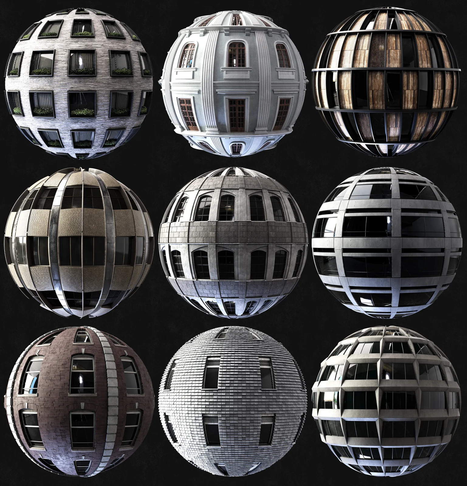 A collection of nine building facade materials created procedurally. The pack provides PBR texture sets delivered at 4K resolution, including maps for base color, roughness, normal, height, and metallic values. A sample Blender file is included containing pre-configured material setups for easy application.