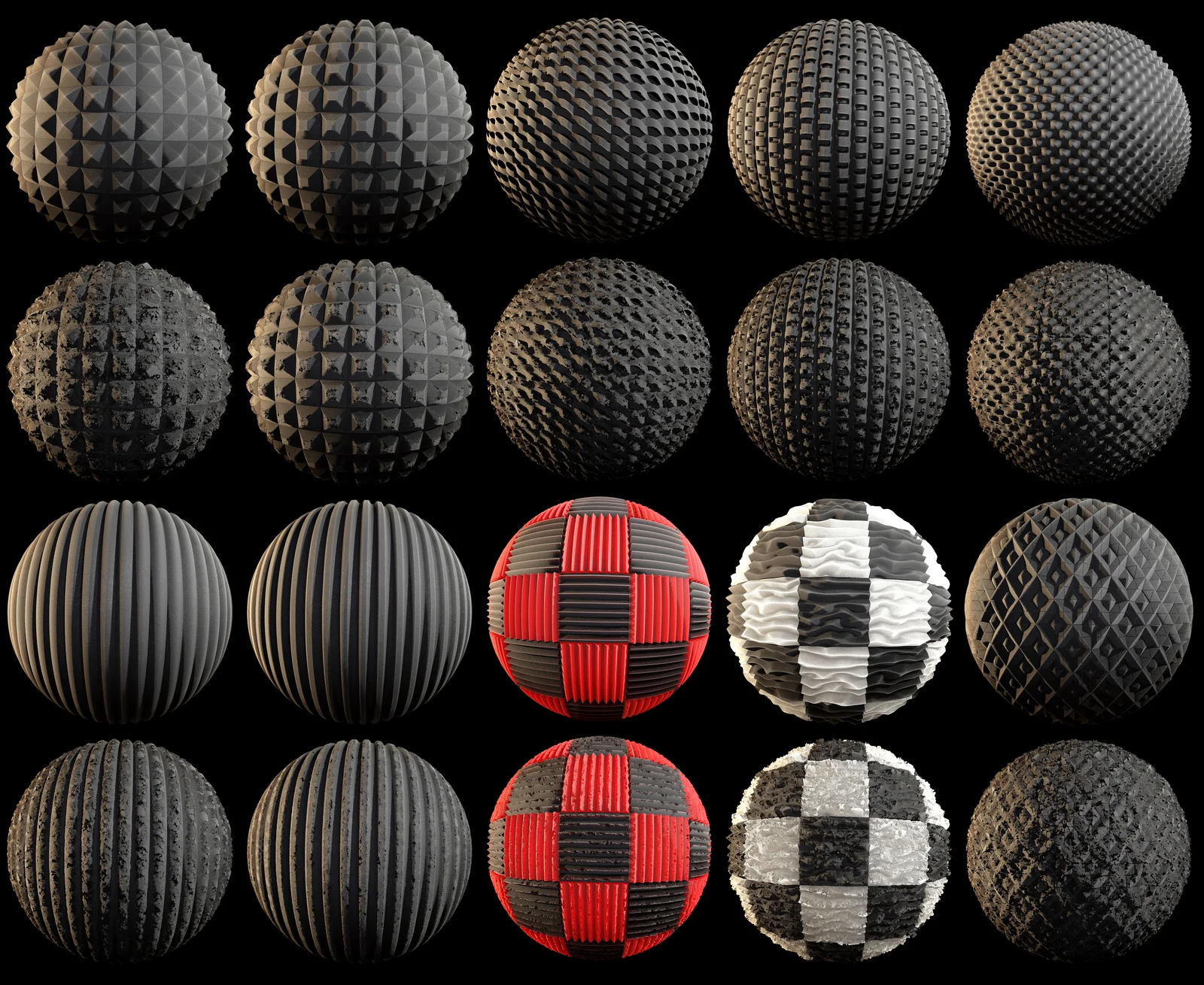 This collection includes nine 4K PBR materials representing various acoustic foam panels. The included surface types feature common soundproofing shapes such as diamond, egg crate, pyramid, tube, wedge, and wave patterns. Each surface type comes with both clean and damaged variations.