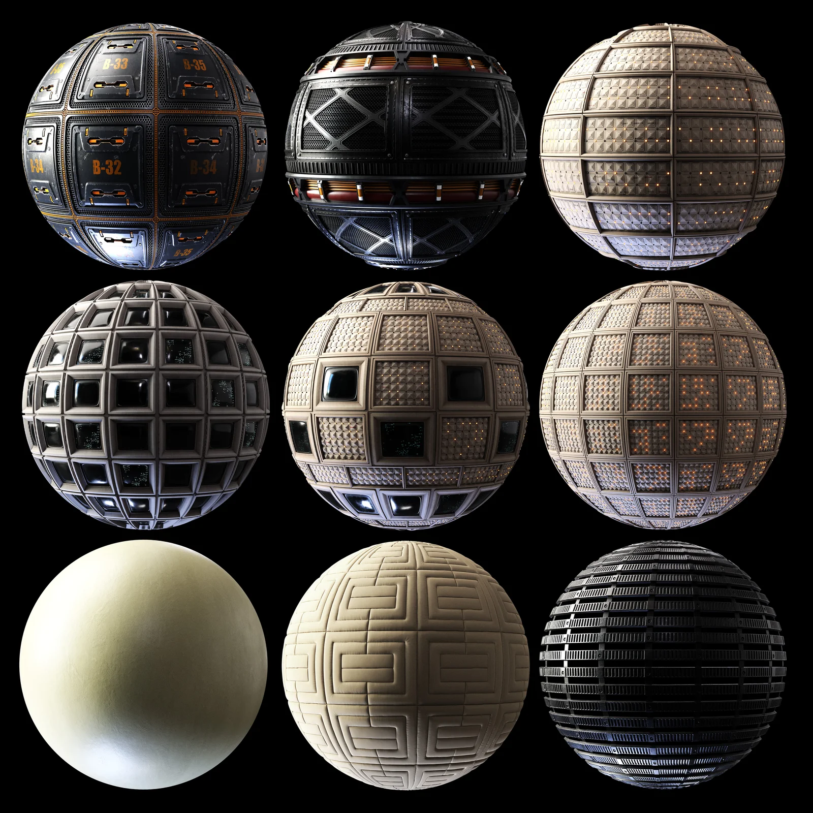 A collection of nine sci-fi themed PBR materials generated in Substance Designer. The pack provides 4K texture maps, including base color, roughness, normal, height, and metallic maps. The included materials cover futuristic surfaces like fabric panels, grids, painted walls, electronic screens, and various sci-fi panel designs. A Blender project file is also provided with the materials already set up.