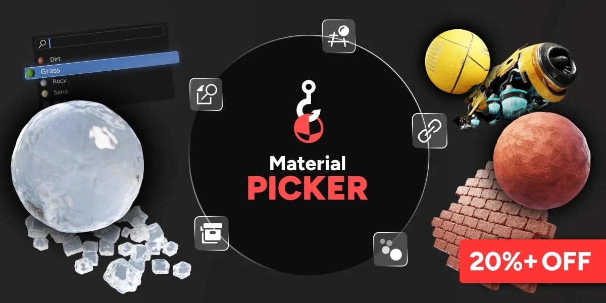 Material Picker is a workflow add-on that allows users to select and edit materials directly from the 3D viewport. By hovering over an object, the tool identifies the active material and makes it accessible for immediate editing. It also includes a dedicated material browser and search function that integrates into the Shader Editor. The add-on supports complex scene setups, including geometry generated via Geometry Nodes, instanced objects, and linked libraries. When selecting a linked material, it can automatically open the corresponding source file for editing.