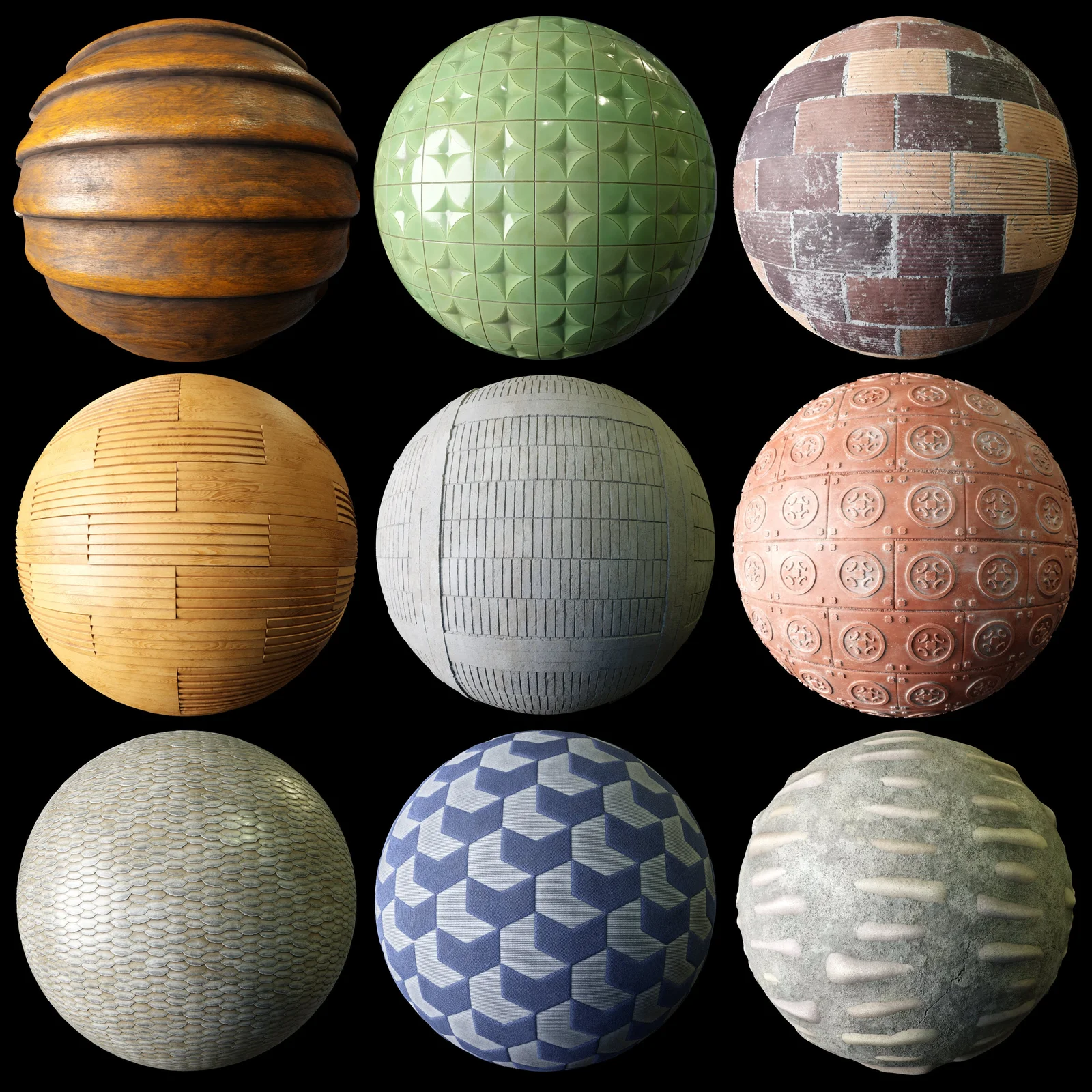This collection provides nine assorted PBR material surfaces in 4K resolution. The pack covers a variety of surface types, including assorted brick walls, concrete and stone mixtures, patterned fabrics, fish scales, ceramic tiles, and decorative wood paneling.