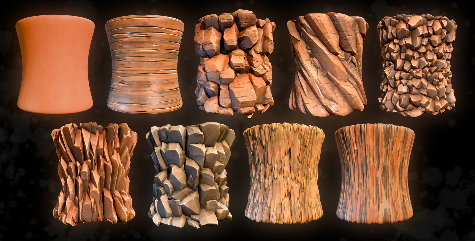 A collection of nine stylized PBR materials focusing on architectural and natural surfaces. The pack includes 4K resolution JPEG textures for each material, providing Diffuse/Base Color, Roughness, Normal, Height, and Metallic maps. A pre-configured Blender file is included for immediate use. The set features variations of stone, wood bark, cut wood, and a plaster wall.