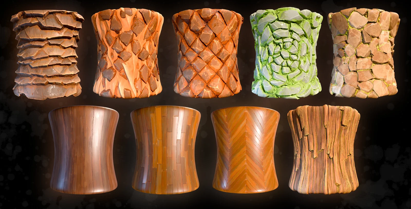 A collection of nine stylized PBR material textures focusing on stone and wood surfaces. The set includes diffuse, roughness, normal, height, and metallic maps provided as 4K JPEG files. Specific materials feature various stone grounds, stone tiles with and without sand, wood bark, and different wooden floor and plank designs. A pre-configured Blender file is also included to easily apply these assets.