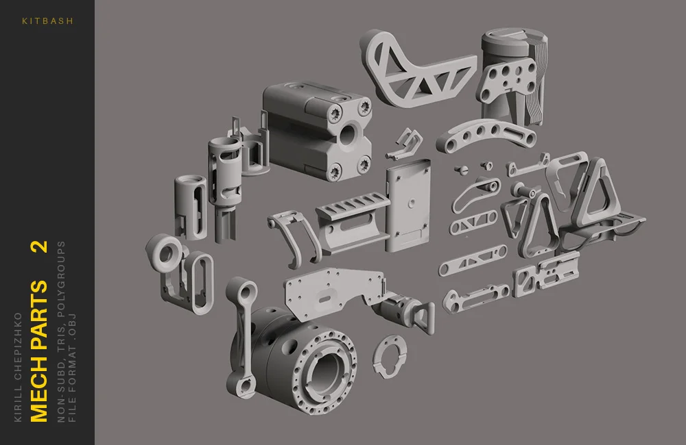 This collection includes approximately 33 detailed mechanical parts designed for concept art and kitbashing. The models feature non-subdivided geometry and are delivered as a single OBJ file. While they include polygroups optimized for creating IMM brushes in ZBrush, the standard OBJ format allows them to be imported and separated in Blender to add mechanical complexity to hard-surface designs.