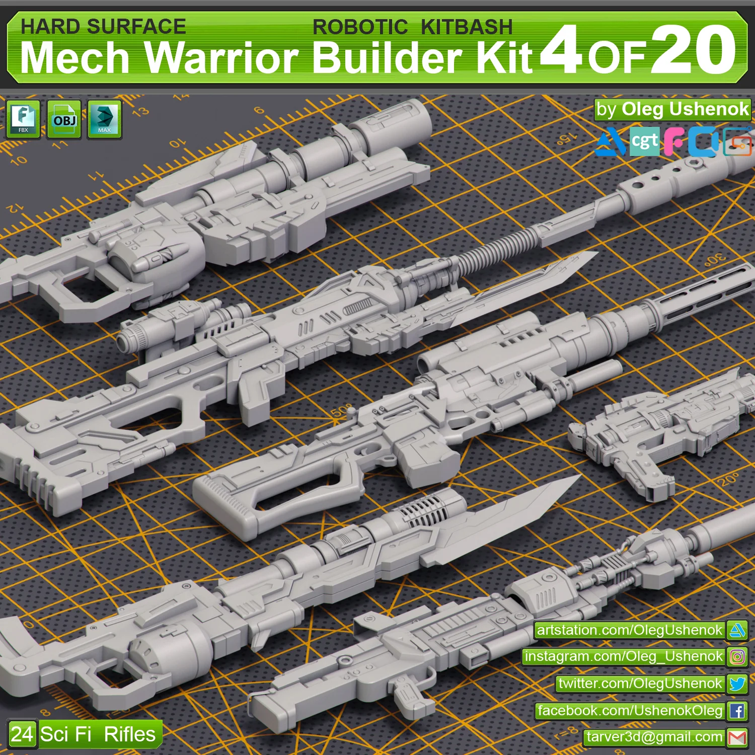 A hard surface kitbash collection containing 24 distinct sci-fi rifle models. These assets are designed for detailing mechanical designs, outfitting futuristic characters, and conceptualizing science fiction weaponry in 3D scenes.