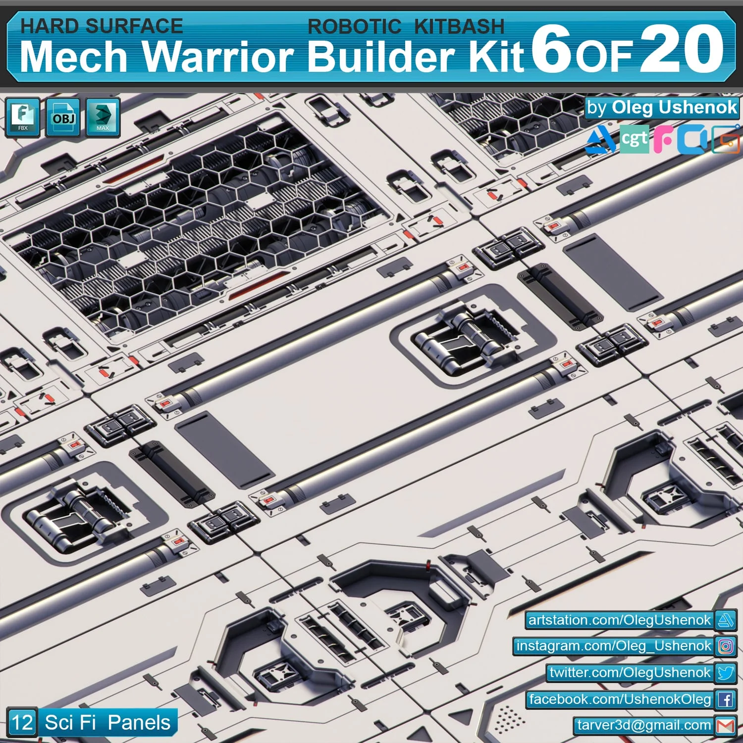 A collection of 12 sci-fi panel models designed for hard surface kitbashing. These geometric components can be used to add structural details to mechanical models, robots, vehicles, and sci-fi environments.