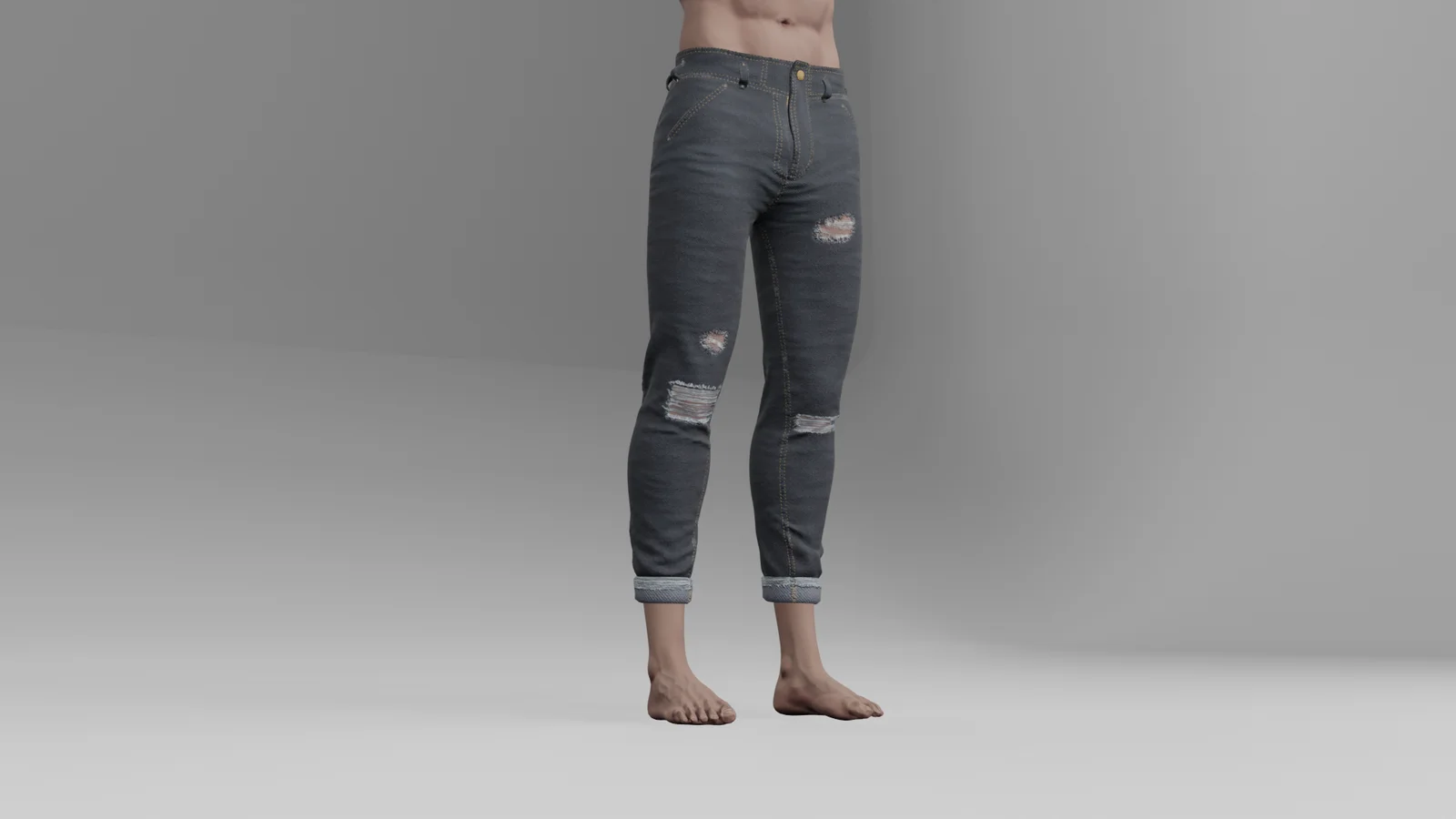 This asset provides a rigged 3D model of male skinny jeans featuring ripped details. The geometry consists of 24,000 triangles and is provided in the standard FBX format. The package includes a complete set of PBR texture maps to facilitate surface rendering. While the download includes a Unity package with pre-configured materials, the core FBX file and images can be imported and used directly within Blender.
