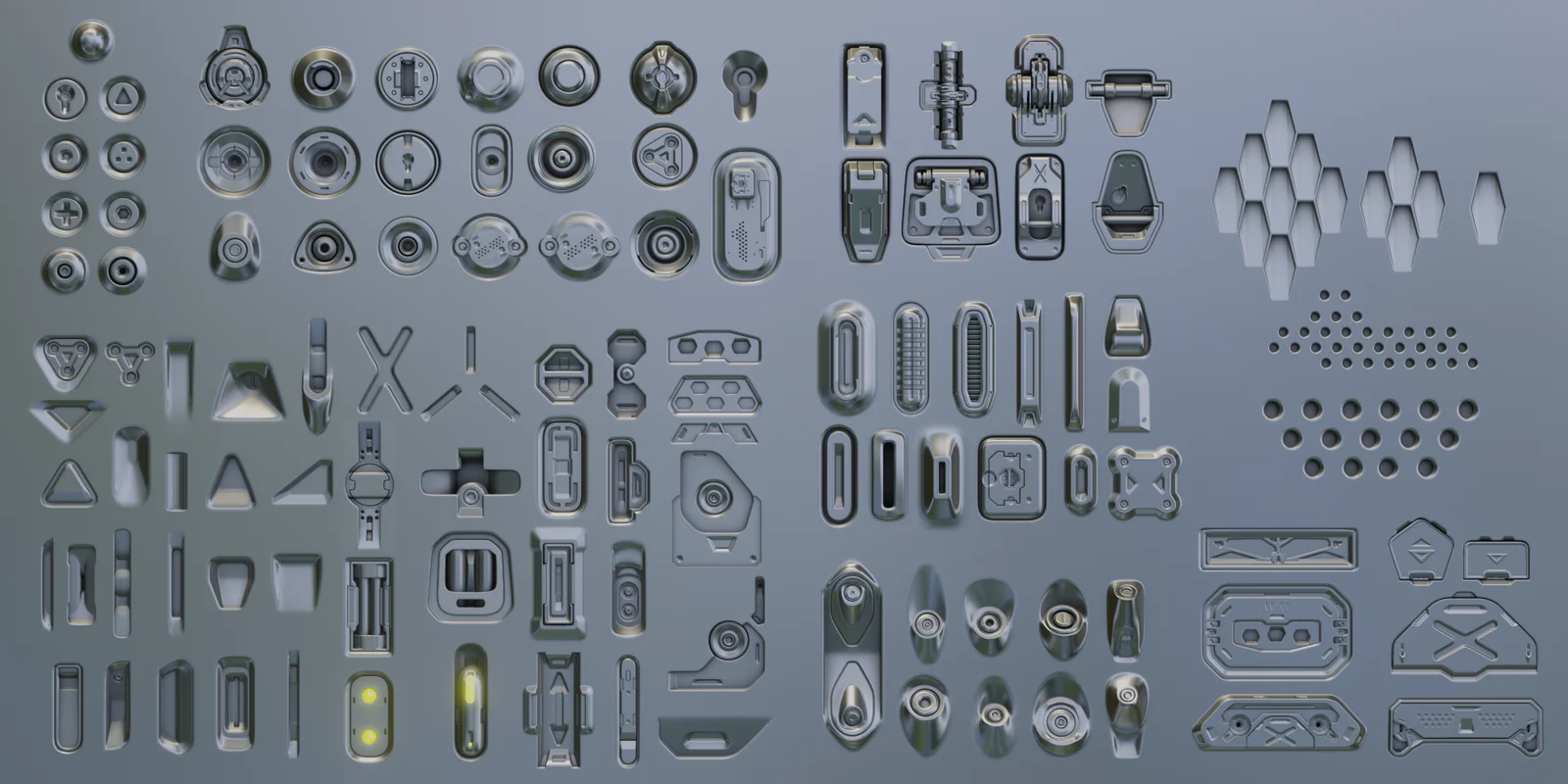 This asset pack provides a library of multipurpose hard surface plugs designed for use with the MESHmachine addon. The collection focuses on tertiary details, allowing users to stamp complex shapes onto existing meshes while maintaining clean subdivision topology.
