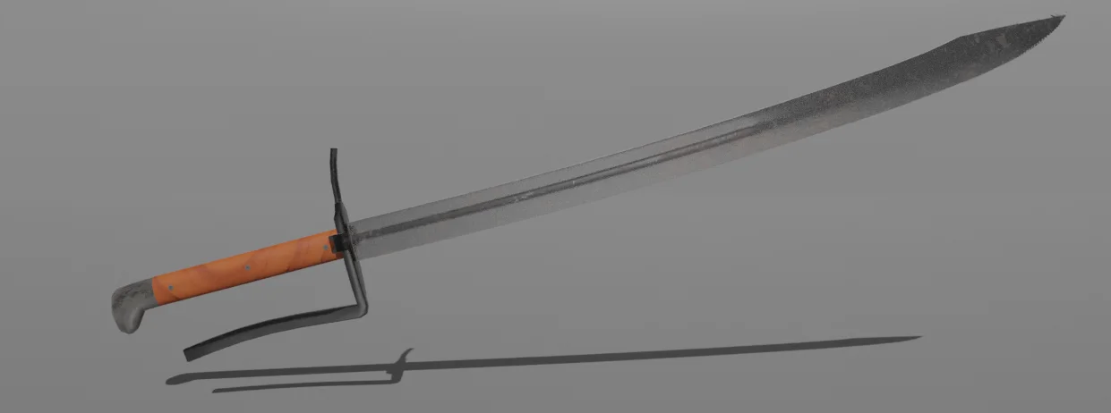 A 3D model of a Messer, a large single-edged sword featuring a knife-like tang. The asset includes a dedicated Blender package alongside custom materials created in Substance Painter, ready for integration into 3D scenes or VRChat projects.
