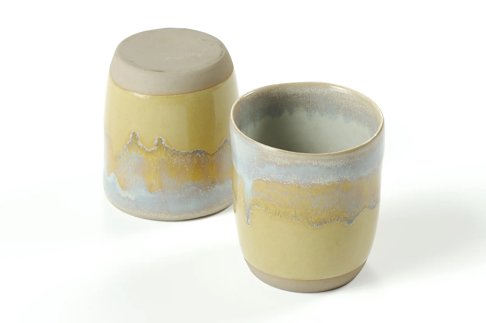 A 3D model of a handmade yellow ceramic cup. The model is based on a 3D scan of a physical object crafted by a ceramicist, preserving the natural variations in its glaze and colors. The asset includes a dedicated file for Blender configured for the Cycles render engine, as well as Cinema 4D files formatted for Octane, alongside standard FBX and OBJ formats.