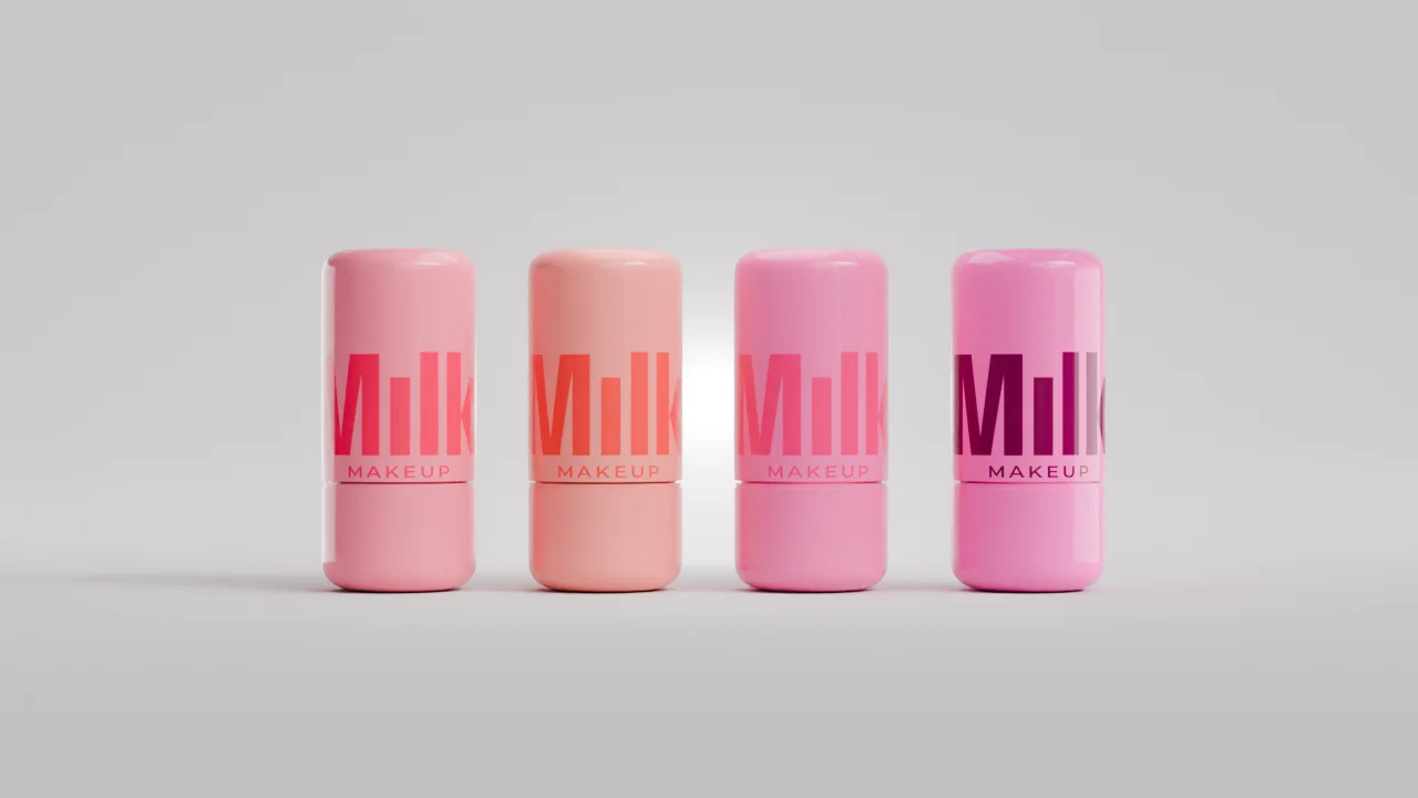 A 3D model representing a Milk Makeup jelly blush cosmetic product. The asset includes a single 3D model paired with four distinct texture sets to represent different product shades. The included color variations are Brust (Poppy Pink), Chill (Red), Spritz (Coral), and Splash (Berry).