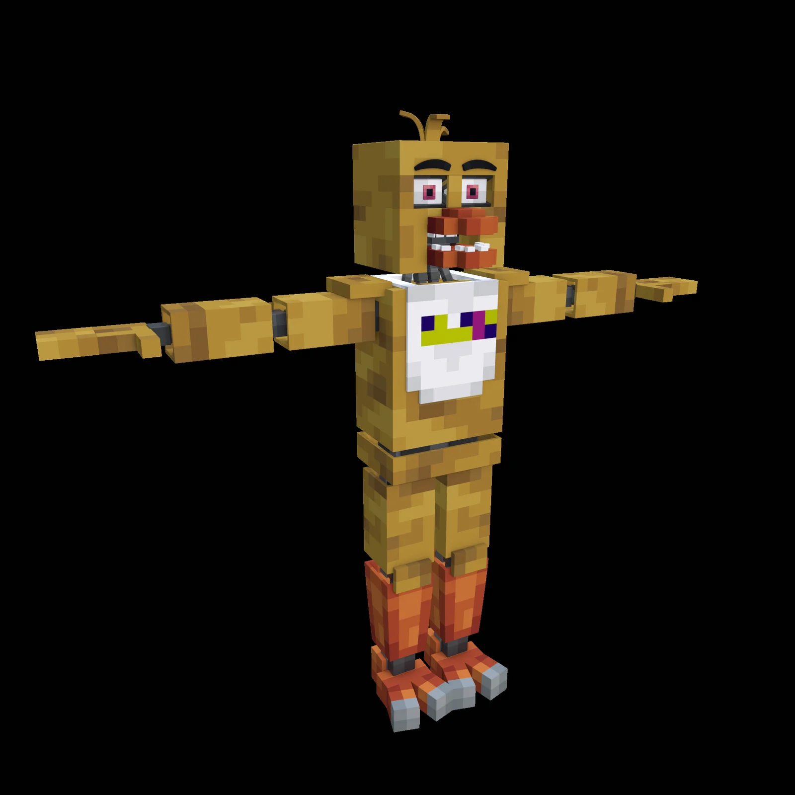 This asset provides a rigged 3D character model of Chica the Chicken, adapted into the blocky, low-poly art style of Minecraft. The package also includes a secondary rigged endoskeleton model designed for character animation and posing within Blender.
